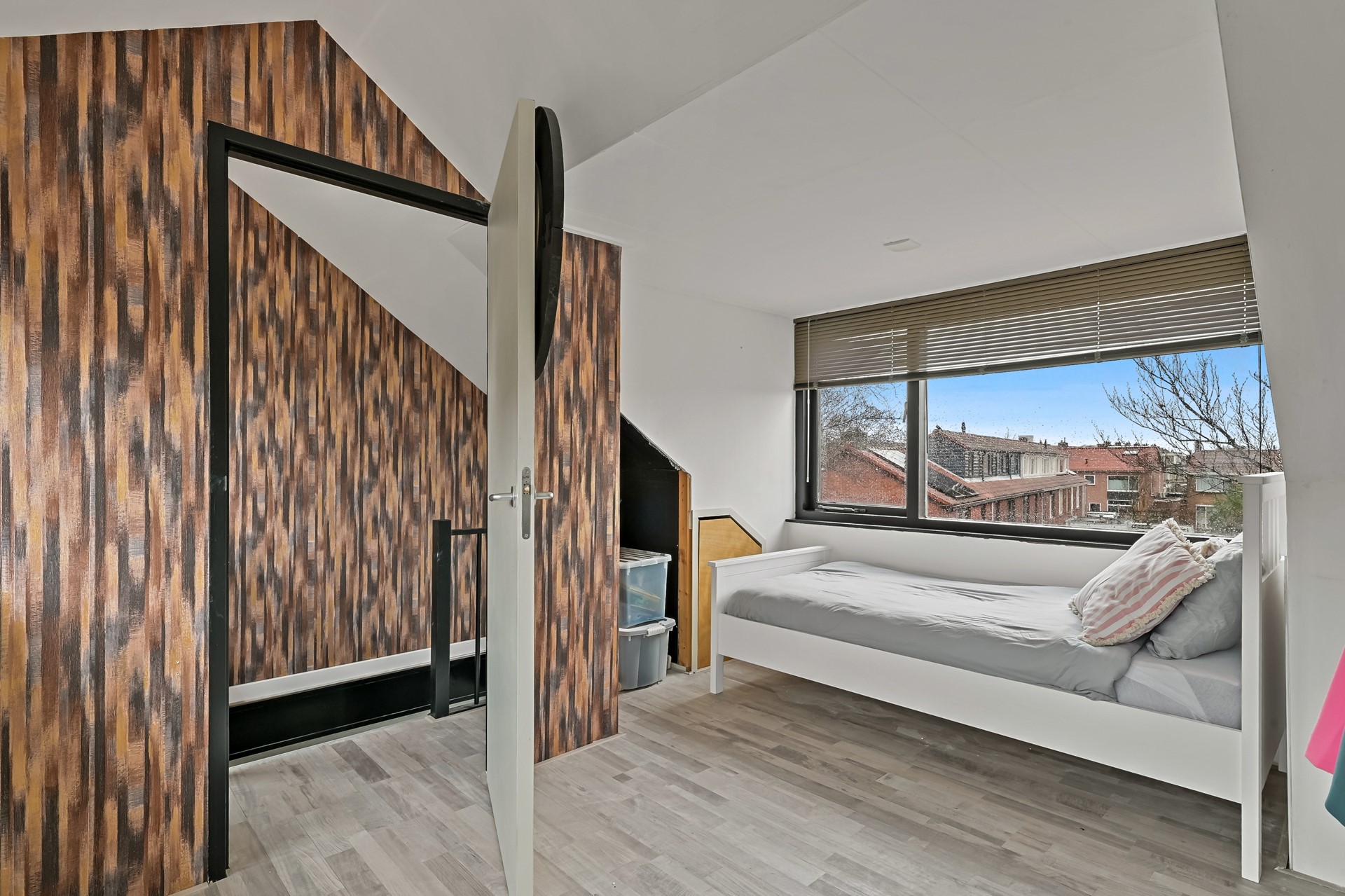 Via de vaste trap kom je uit op de tweede verdieping. Vanaf de overloop is er toegang tot een ruime en lichte zolderkamer. Dankzij de nokverhoging met dakkapel aan de voorzijde is hier aanzienlijk meer ruimte en daglicht ontstaan. Deze kamer is uitstekend geschikt om te gebruiken als extra slaapkamer, werkkamer of hobbyruimte. Bovendien is er in deze kamer veel bergruimte te vinden achter de knieschotten.