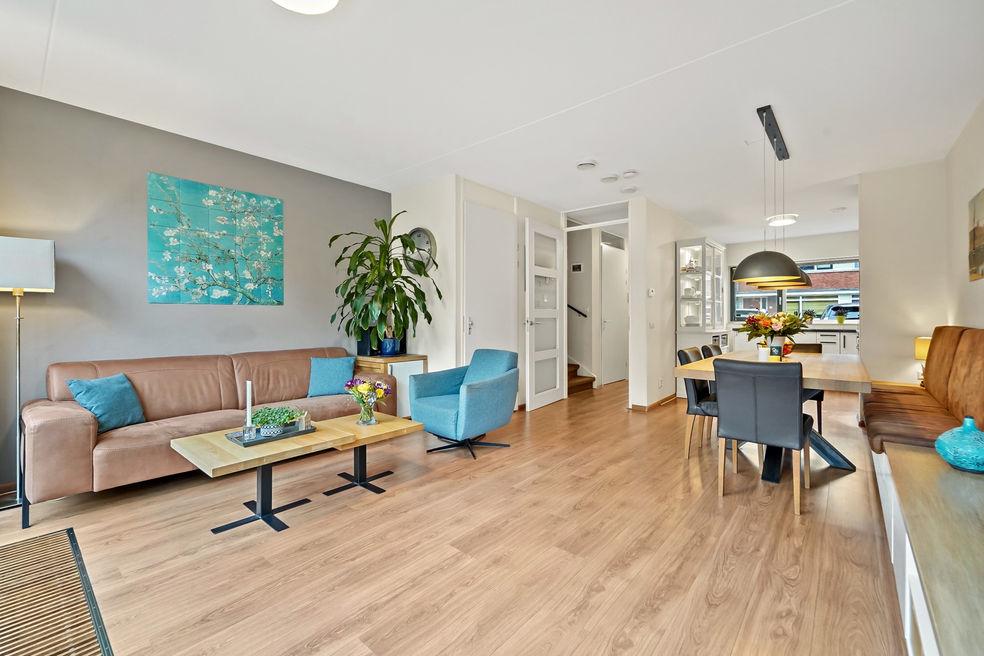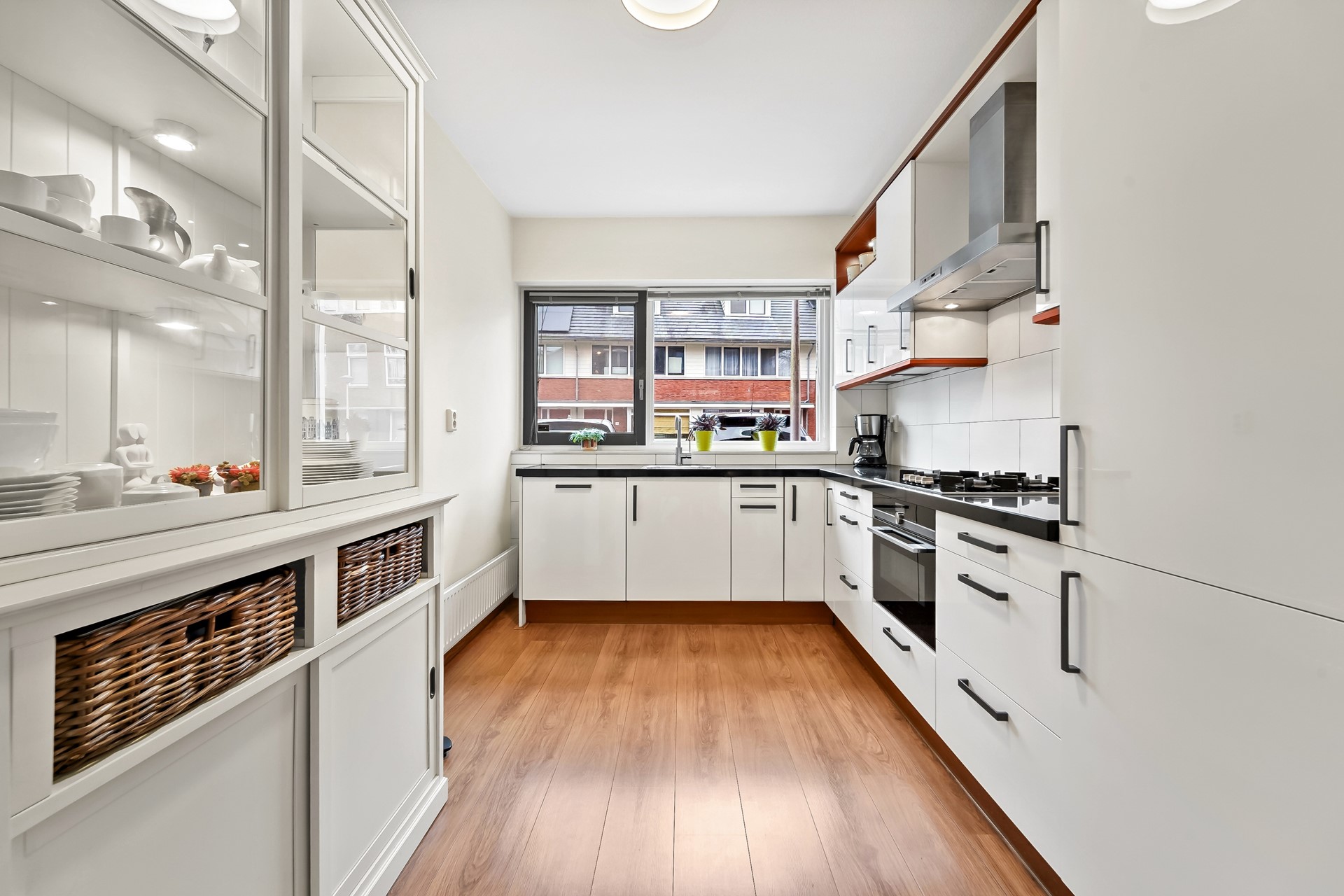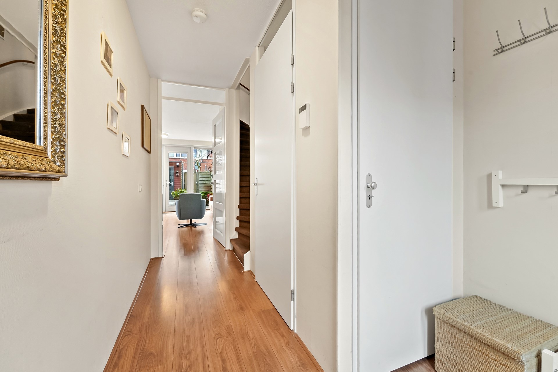 Entree, hal met meterkast, garderoberuime, toiletruimte met fonteintje en trap naar 1e verdieping. De woning beschikt over een lichte, tuingerichte woonkamer met dubbele deuren naar de zonnige achtertuin. De fraai aangelegde achtertuin biedt volop ruimte om te ontspannen, te spelen of gezellig buiten te eten, mede dankzij de zonnige zuidwest ligging. Achterin de tuin bevindt zich een praktische fietsenberging. De tuin is aan de achterzijde ontsloten via een brede poort. Aan de voorzijde van de woning bevindt zich de moderne keuken. Deze keuken is in 2025 gerenoveerd en is voorzien van diverse moderne inbouwapparatuur, waaronder een koel-vriescombinatie, 4 pits gaskookplaat, combi oven/magnetron, vaatwasser en afzuigkap. Een fijne ruimte met een moderne, frisse uitstraling, helemaal klaar voor vele jaren kookplezier. De gehele begane grond is voorzien van een laminaatvloer.