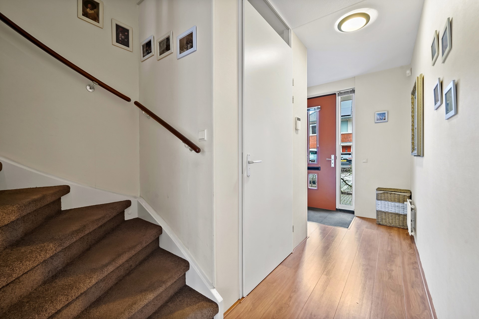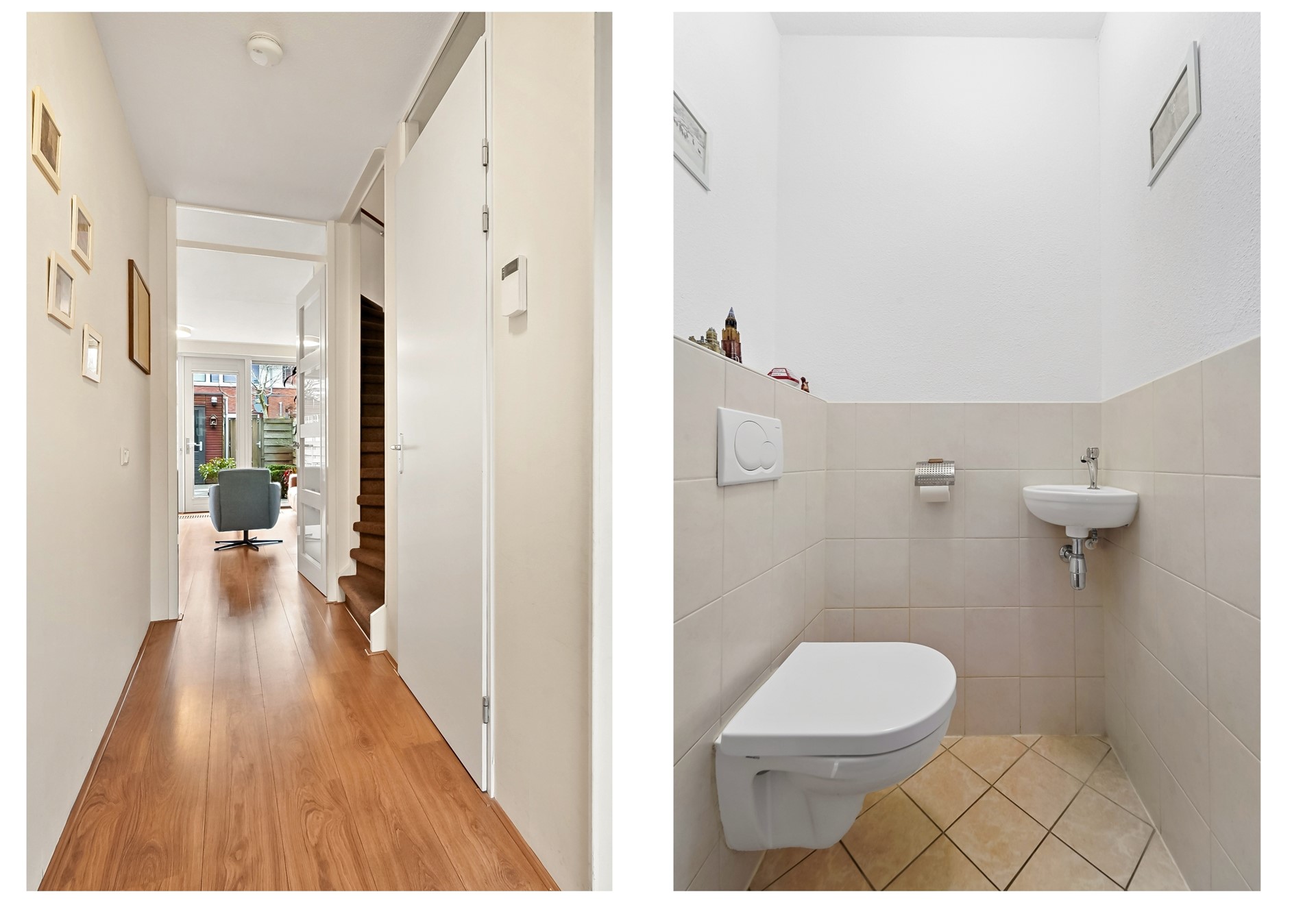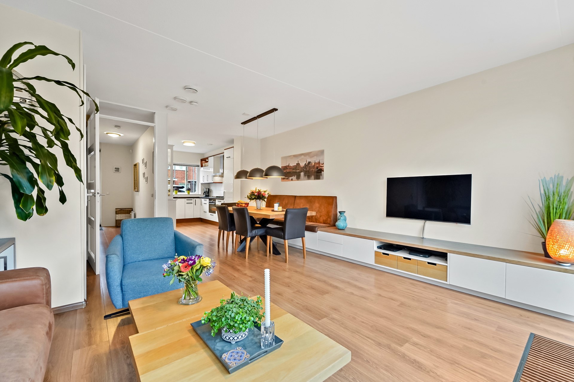 Entree, hal met meterkast, garderoberuime, toiletruimte met fonteintje en trap naar 1e verdieping. De woning beschikt over een lichte, tuingerichte woonkamer met dubbele deuren naar de zonnige achtertuin. De fraai aangelegde achtertuin biedt volop ruimte om te ontspannen, te spelen of gezellig buiten te eten, mede dankzij de zonnige zuidwest ligging. Achterin de tuin bevindt zich een praktische fietsenberging. De tuin is aan de achterzijde ontsloten via een brede poort. Aan de voorzijde van de woning bevindt zich de moderne keuken. Deze keuken is in 2025 gerenoveerd en is voorzien van diverse moderne inbouwapparatuur, waaronder een koel-vriescombinatie, 4 pits gaskookplaat, combi oven/magnetron, vaatwasser en afzuigkap. Een fijne ruimte met een moderne, frisse uitstraling, helemaal klaar voor vele jaren kookplezier. De gehele begane grond is voorzien van een laminaatvloer.