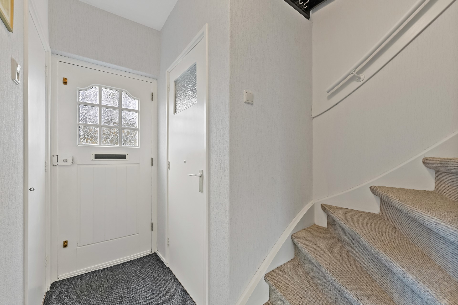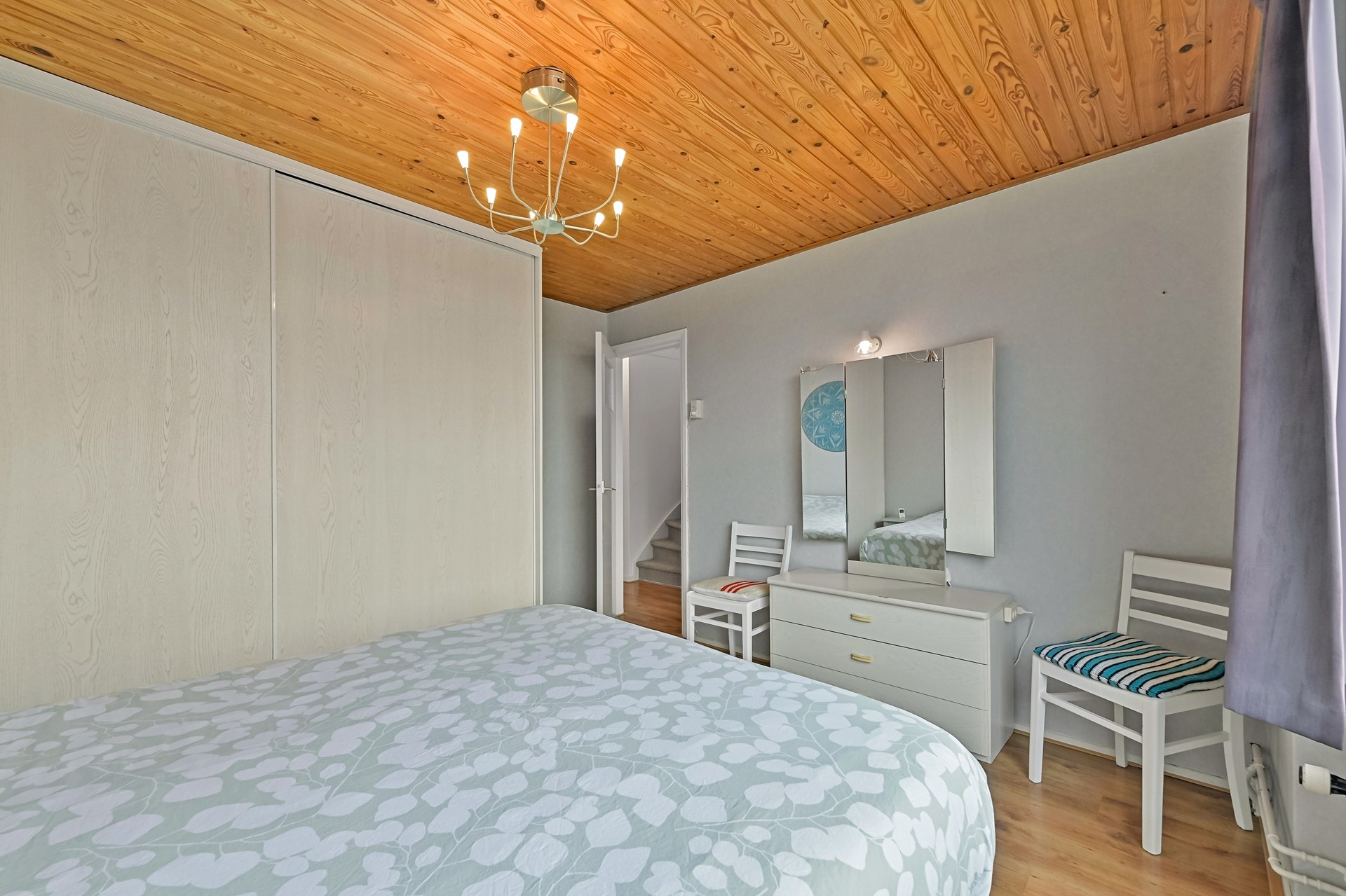 Overloop met toegang tot drie slaapkamers en de badkamer. Aan de achterzijde bevinden zich twee slaapkamers. De grootste kamer is in gebruik als hoofdslaapkamer en beschikt over een vaste kast met schuifdeuren. De kleinere kamer wordt gebruikt als hobbyruimte/werkplek. Aan de voorzijde bevinden zich de derde slaapkamer en de badkamer. De badkamer is compact maar functioneel ingericht. Er is een inloopdouche en een wastafelmeubel aanwezig.