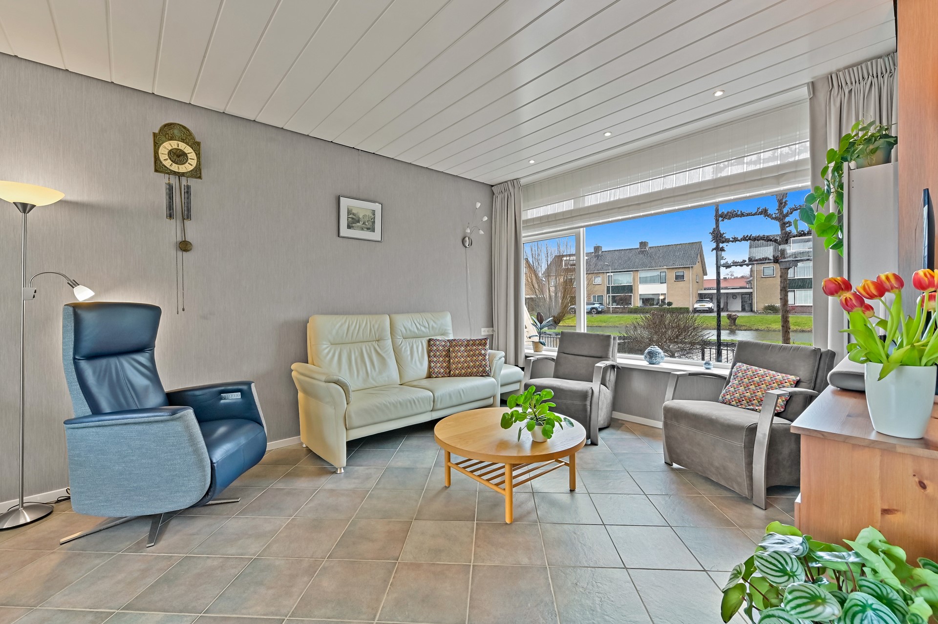 Via de fraai aangelegde voortuin met diverse beplanting bereikt u de entree met hal, meterkast, toiletruimte en trapopgang. Vanuit de hal komt u in de lichte woonkamer met trapkast en grote schuifpui aan de achterzijde, waardoor de woonkamer in directe verbinding staat met de tuin. Aan de voorzijde heeft u een schitterend uitzicht over de singel naar de weilanden langs de Koningin Julianaweg. De keuken aan de achterzijde bevindt zich in een uitbouw met lichtkoepel en loopdeur naar de tuin. De keuken is praktisch ingedeeld en voorzien van diverse inbouwapparatuur waaronder een koelkast, oven, 5 pits gaskookplaat en afzuigkap. De woonkamer en keuken zijn voorzien van vloerisolatie en comfortabele vloerverwarming. Grenzend aan de keuken vindt u de bijkeuken met opstelplaats voor onder andere de wasmachine, wasdroger en de C.V. ketel. De diepe achtertuin (ca. 8,5 meter) beschikt over een aangebouwde schuur en een achterom. Aan de gevel is een zonnescherm en tuinverlichting gemonteerd.