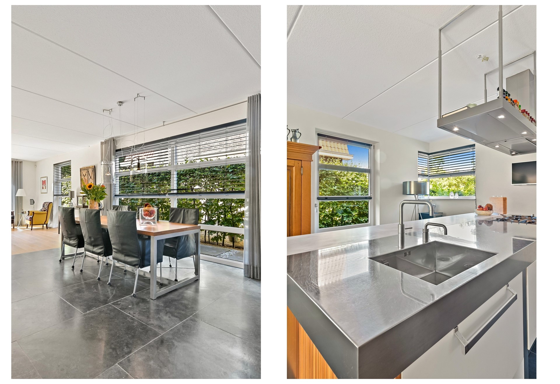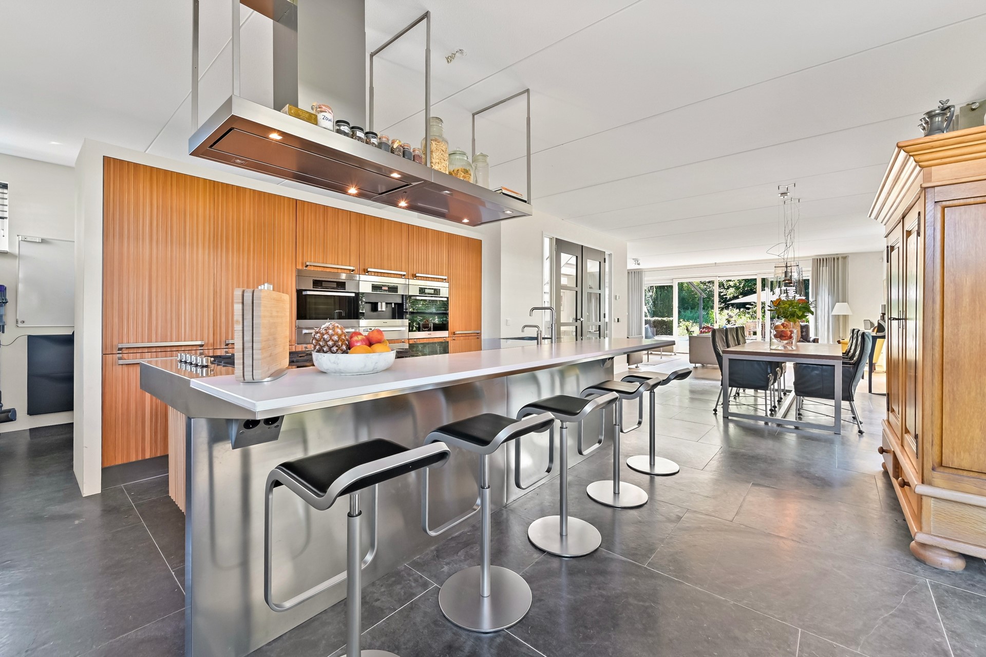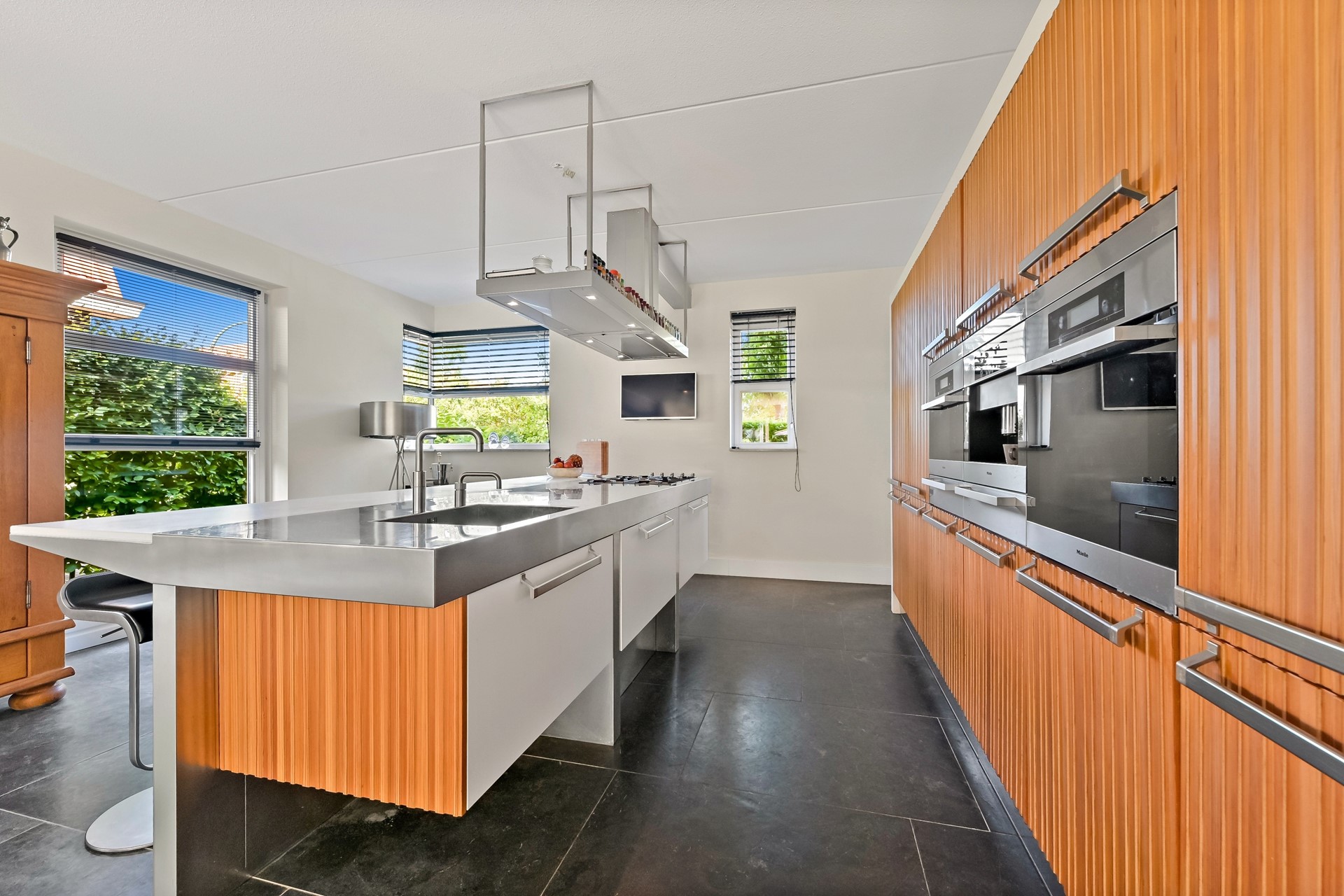 Via de verzorgd aangelegde voortuin met meerdere parkeerplaatsen en laadpaal op eigen terrein bereikt u de garage en hoofdentree van de woning aan de zijkant. Bij binnenkomst ervaart u direct een luxe sfeer door de aanwezigheid van een ruim opgezette hal met statige trap, indrukwekkende vide en grote raampartijen. In de hal vindt u de meterkast, garderobe en de moderne toiletruimte naast de voordeur welke is voorzien van een wandcloset en fonteintje. De dubbele deuren brengen u vanuit de hal naar de zeer royale living met open woonkeuken aan de voorzijde. De luxe, moderne keuken met kastenwand en kook-/spoeleiland van het merk Arclinea is uitgerust met een RVS werkblad met geïntegreerde spoelbak en vijfpits gaskookplaat en hoogwaardige inbouwapparatuur, waaronder een ingebouwde RVS afzuigkap, oven, koel-vrieskast, combi-stoom-oven, koffieautomaat, twee warmhoudlades en vaatwasser. Achter de keuken bevindt zich een praktische bijkeuken welke tevens te bereiken is via een deur in de zijgevel. In deze bijkeuken vindt u naast de diverse opbergmogelijkheden een spoelbak, extra koelkast en vriezer. De zeer royale L-vormige woonkamer is aan de achterzijde en zijkant van de woning gesitueerd. De woonkamer biedt voldoende plek voor een zeer ruime zithoek en grote eettafel, welke momenteel tussen de woonkamer en de keuken te vinden is. Dankzij de grote raampartijen in de zijgevel komt er van drie zijden licht de woning binnen. De royale schuifpui in de achtergevel biedt toegang tot de schitterende, op het zuiden georiënteerde achtertuin. De achtertuin is onder architectuur aangelegd en voorzien van onder andere een onderheid terras, elektrisch bedienbaar zonnescherm, drainagesysteem, buitenkraan en tuinverlichting. In de achtertuin zijn meerdere terrassen te vinden waardoor u gedurende de dag altijd wel een plekje in de zon (en schaduw) kunt vinden. De achtertuin grenst via een watergang aan het Maaslandse Bos, waardoor u heel veel privacy in de tuin zult ervaren. Vanuit de achtertuin is tevens de garage te bereiken. In de garage vindt u onder andere elektra, verlichting, op maat gemaakte kasten en dubbele deuren naar de oprit aan de voorzijde. Ook is er in de garage een 220 grondkabel aanwezig, welke naar de achtertuin is doorgetrokken. De garage is een ideale plek voor het opbergen van uw spullen of bijvoorbeeld het stallen van de fietsen van het gehele gezin.
