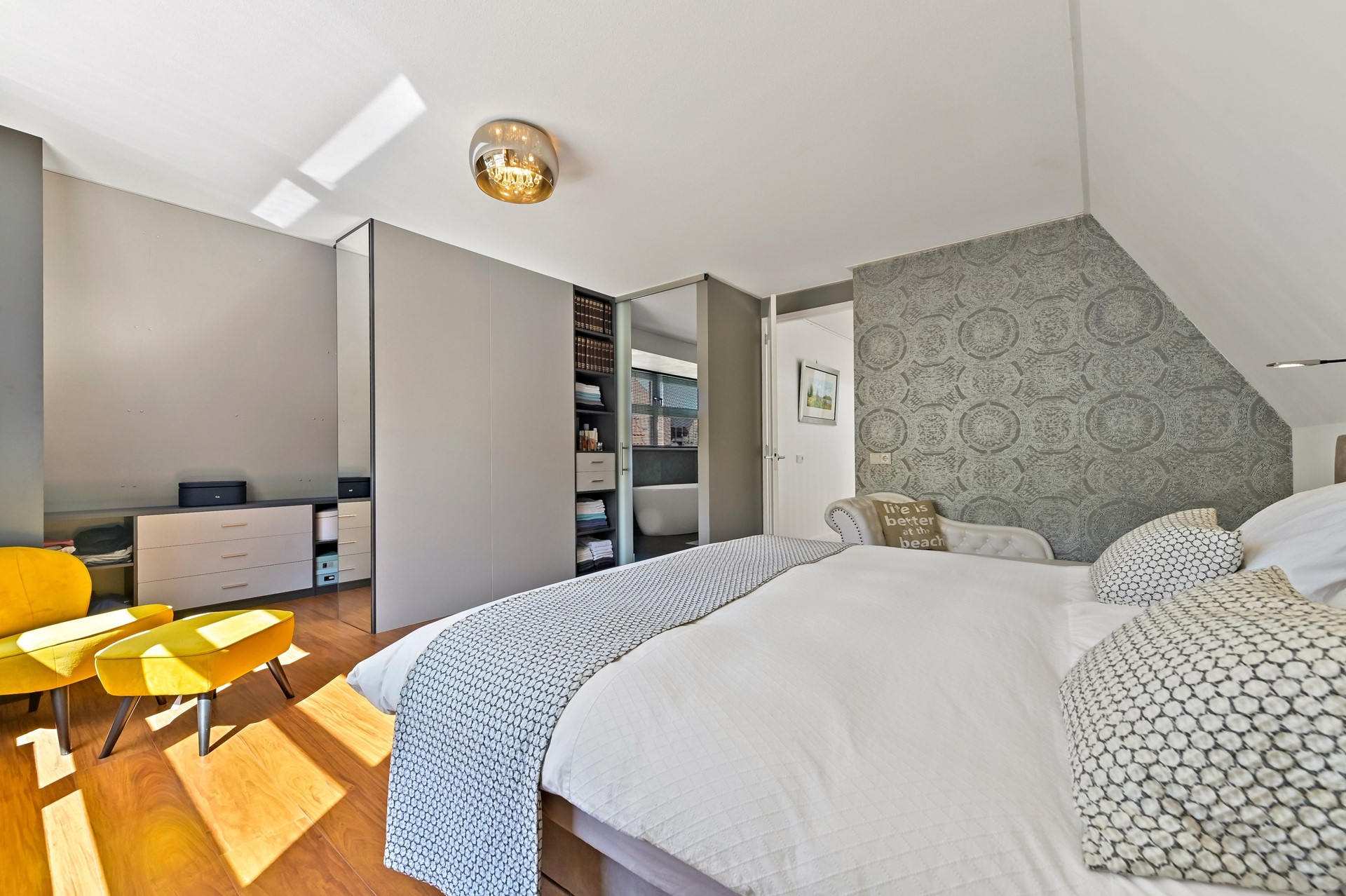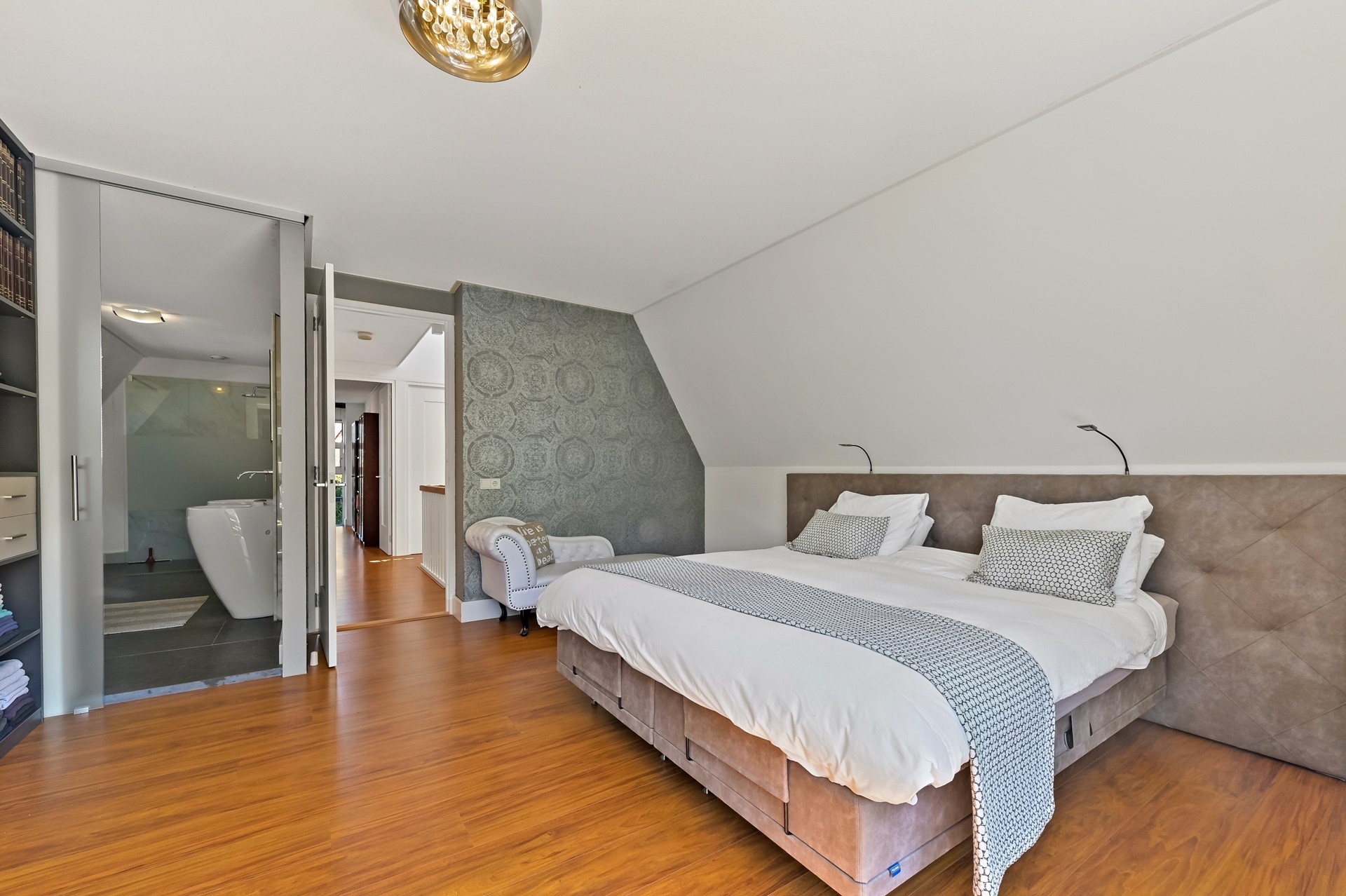 De lichte overloop met trapopgang naar de tweede verdieping biedt toegang tot alle vertrekken op deze etage. De master bedroom bevindt zich aan de achterzijde van de woning. In deze slaapkamer is een lagere raampartij aanwezig waardoor u vanuit het bed fantastisch uitzicht heeft op het groen. In de master bedroom is een walk-in closet aanwezig evenals een deur naar de aangrenzende badkamer. De luxe, moderne badkamer is voorzien van een royale inloopdouche, vrijstaand ligbad, twee wastafels met ingebouwde spiegelkasten, radiator en tweede toilet. De badkamer is tevens vanaf de overloop te bereiken. Aan de voorzijde zijn twee slaapkamers gesitueerd. De grootste slaapkamer is voorzien van een inloopkast en heeft dankzij het dubbele dakraam veel lichtinval. De tweede slaapkamer is op dit moment in gebruik als kantoorruimte.