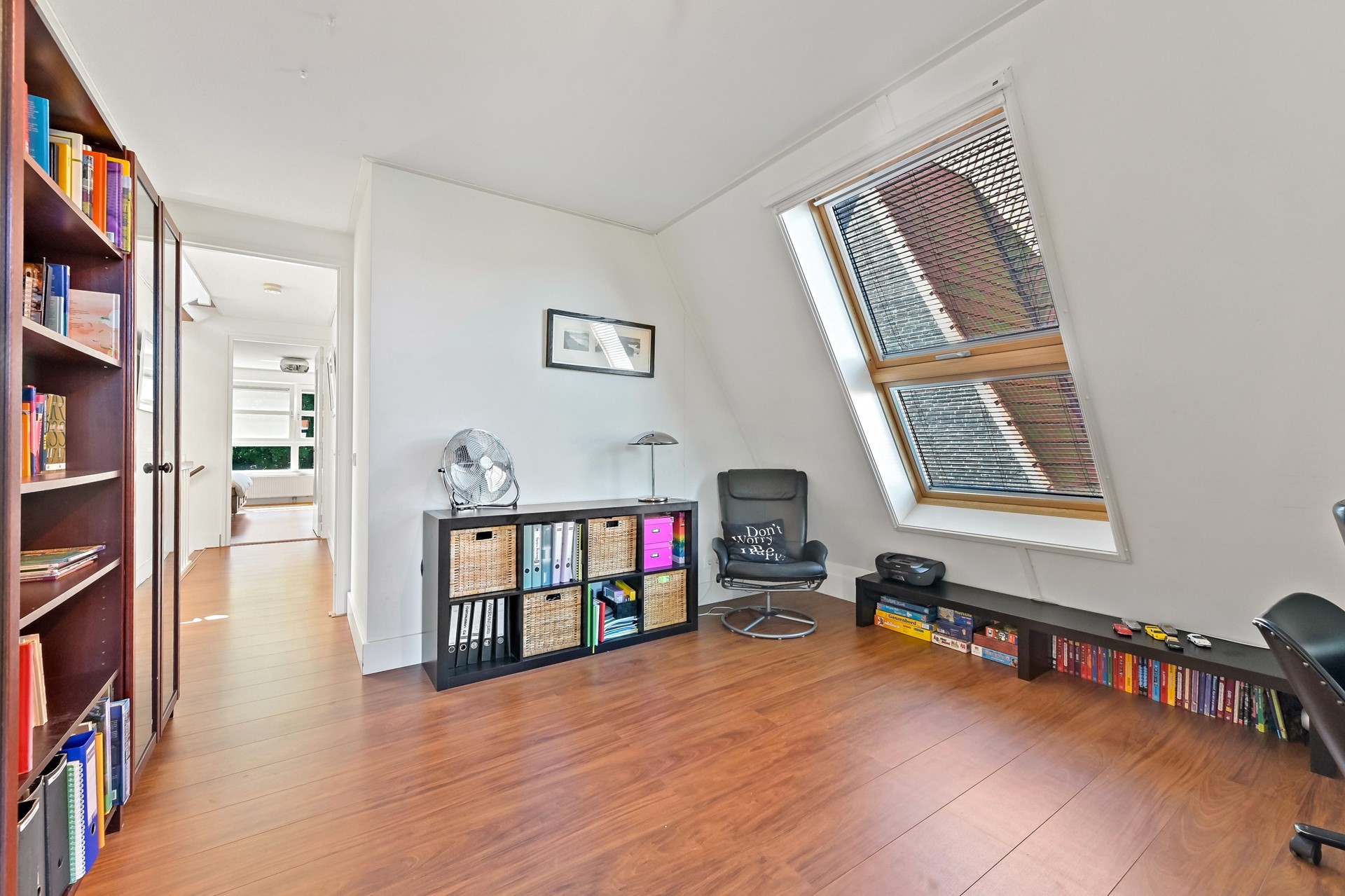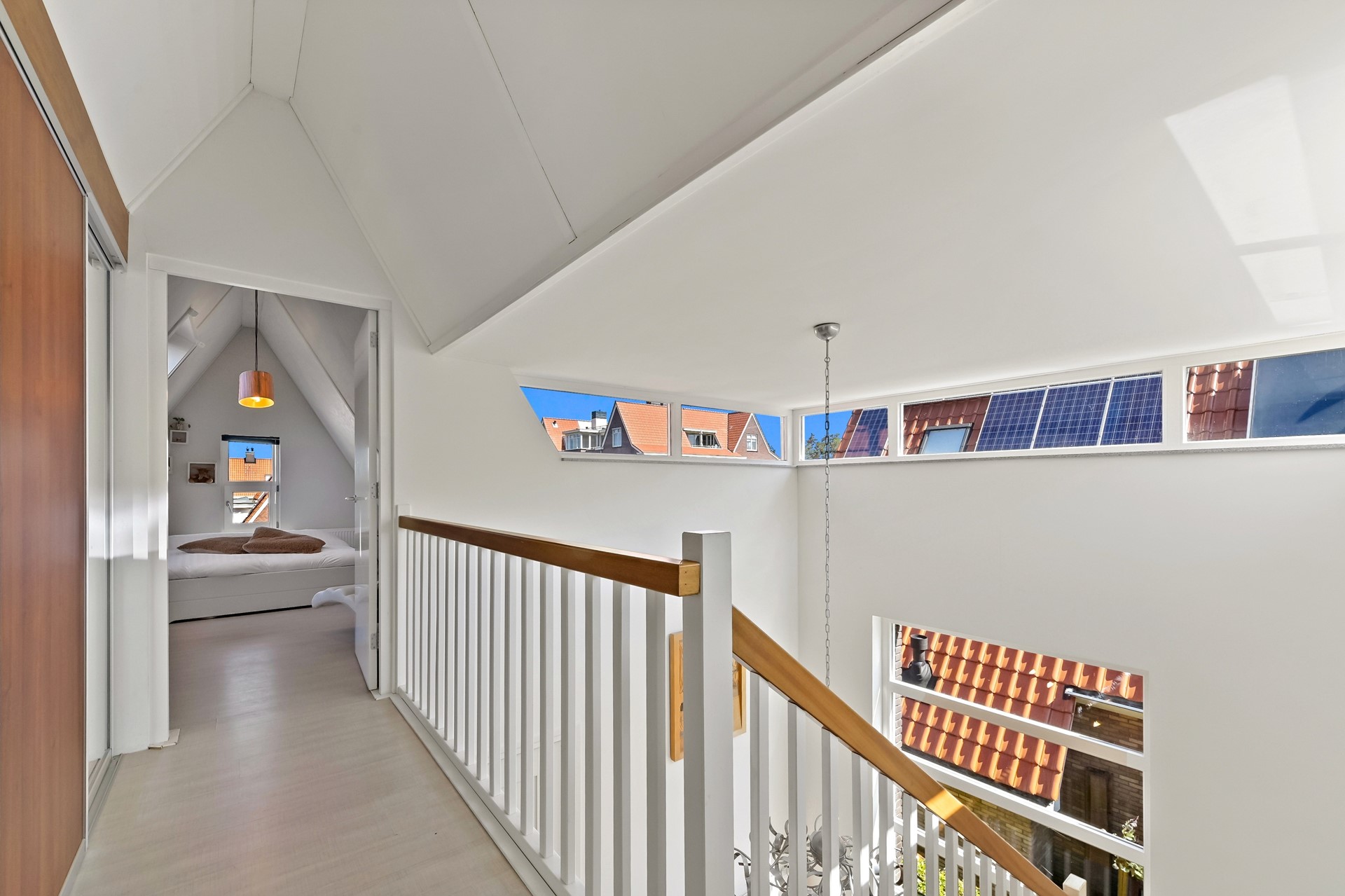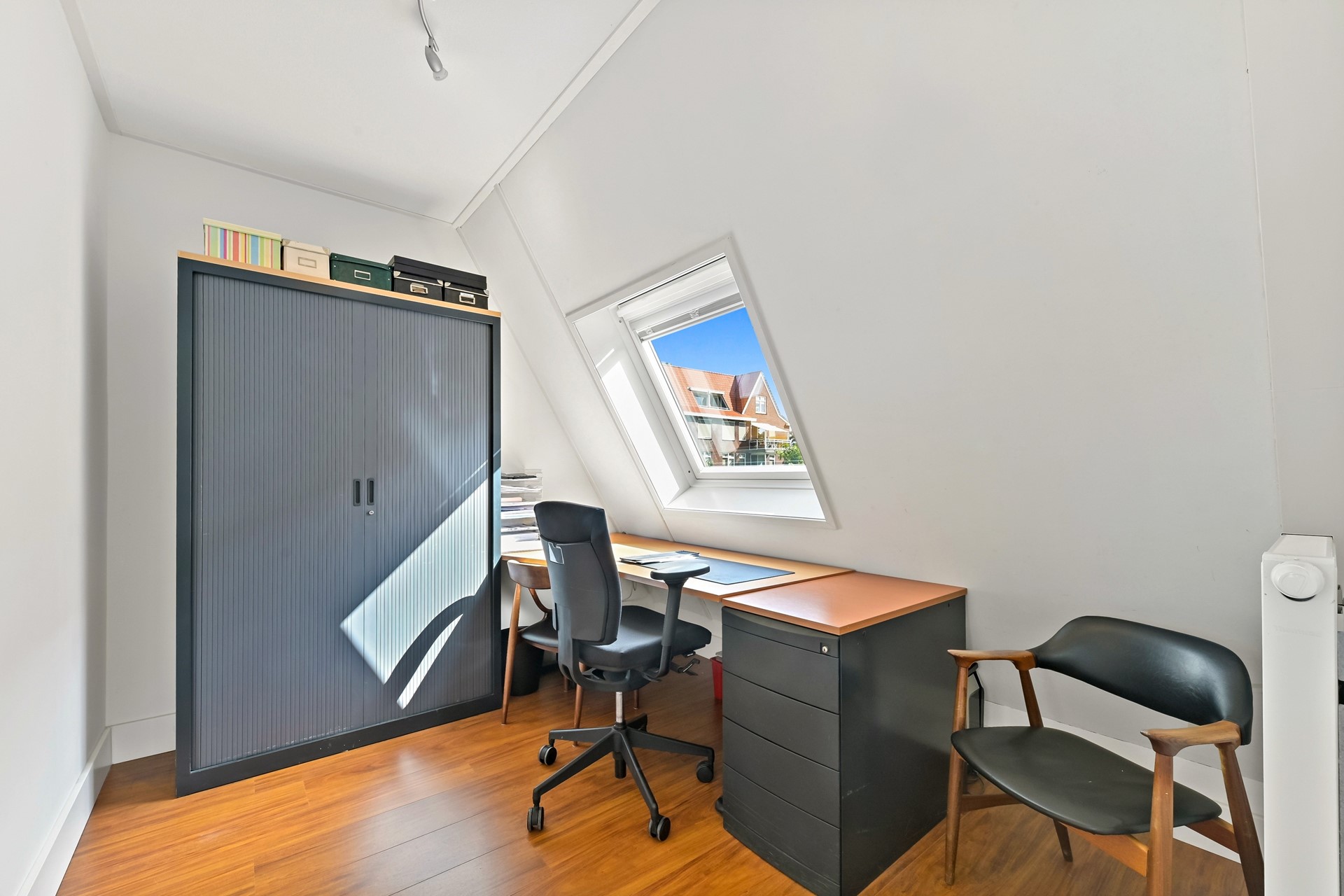 Ook de tweede verdieping van deze woning is door de aanwezigheid van de diverse raampartijen heerlijk licht. Op de overloop is een vaste kast aanwezig met opstelplaats voor de wasmachine, wasdroger, C.V. ketel en mechanische ventilatie. De sfeervolle slaapkamer aan de voorzijde is voorzien van een hoge nok. De andere slaapkamer bevindt zich aan de achterzijde en is op dit moment in gebruik als walk-in closet. Deze kamer kan met gemak als extra slaapkamer worden gebruikt.