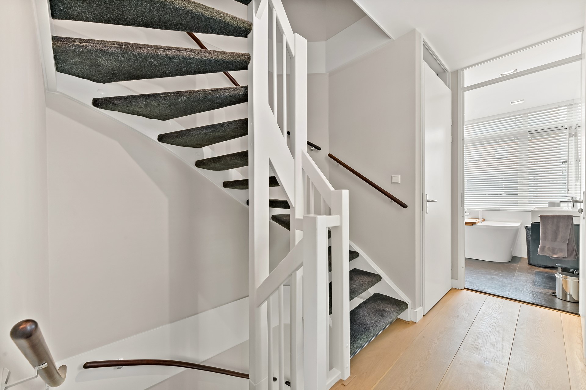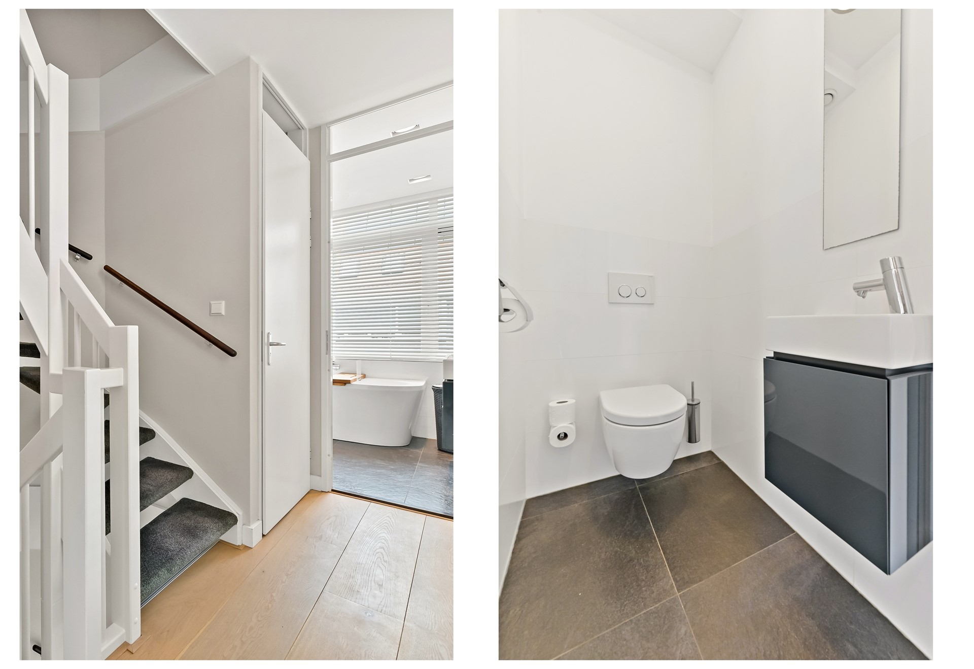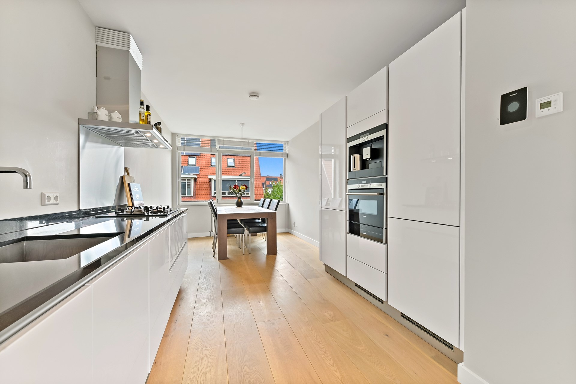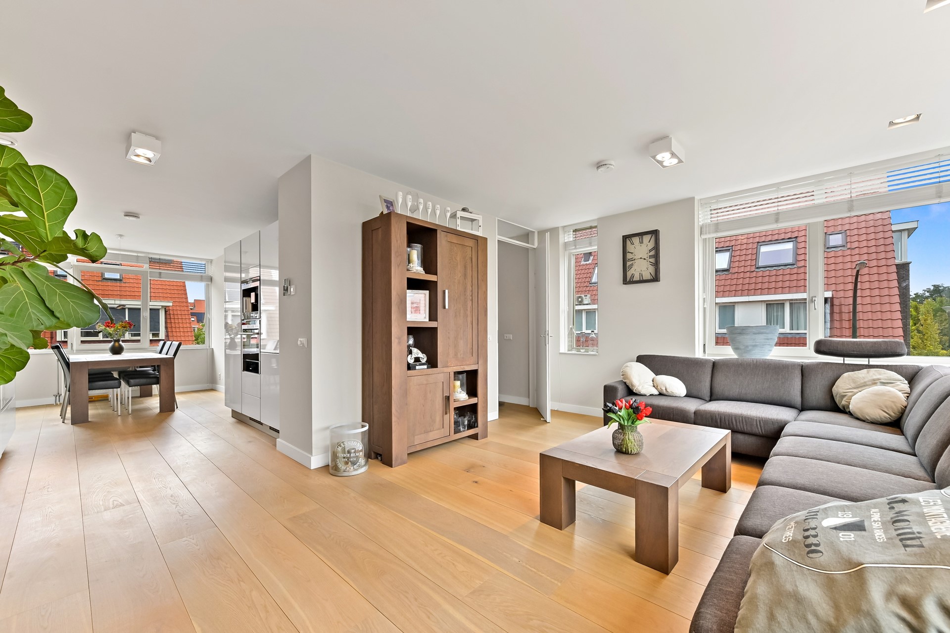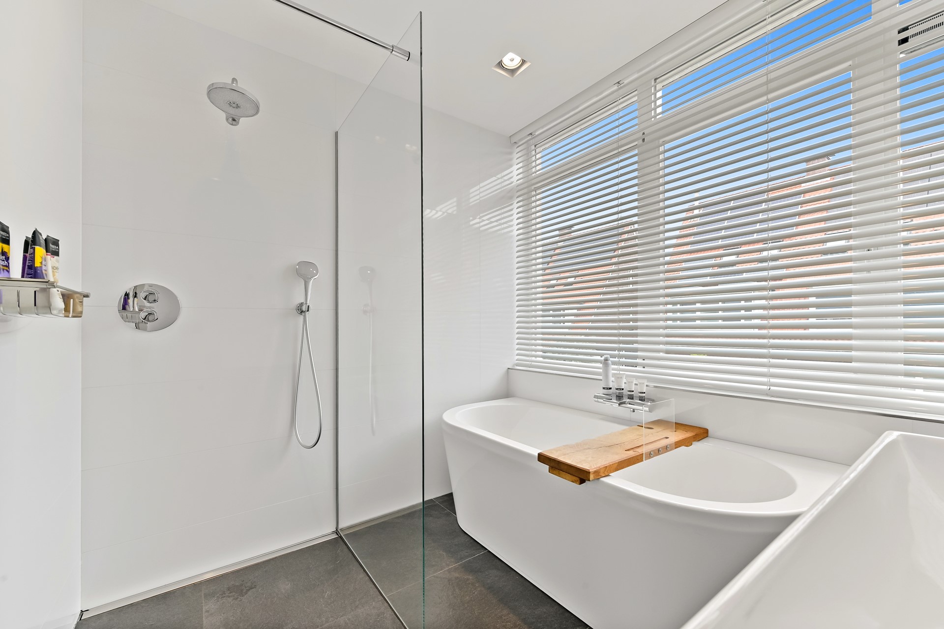 Vanaf de ruime overloop met separaat toilet hebt je toegang tot de woonruimte. De woonkamer bevindt zich aan de voorzijde van de woning. Hier valt direct op hoeveel licht er in de woning binnenkomt. De keuken bevindt zich centraal in de woning. De keuken is luxe en voorzien van kwalitatief hoogwaardige inbouwapparatuur. Achter de keuken is het tweede gedeelte van de woonkamer gelegen, welke ruimte in gebruik is als eetkamer. Eventueel is het mogelijk om hier een derde slaapkamer te realiseren. De vloer van de woongedeeltes bestaat uit een fraaie houten vloer met brede vloerdelen. Het plafond is strak gestuukt en benadrukt het hoogwaardige afwerkingsniveau in deze woning. De badkamer bevindt zich aan de achterzijde van de woning. De badkamer is luxe en beschikt over een riante inloopdouche, designradiator, een wastafelmeubel en een vrijstaand ligbad.