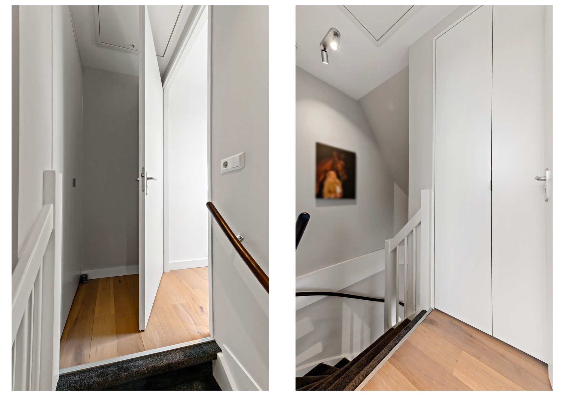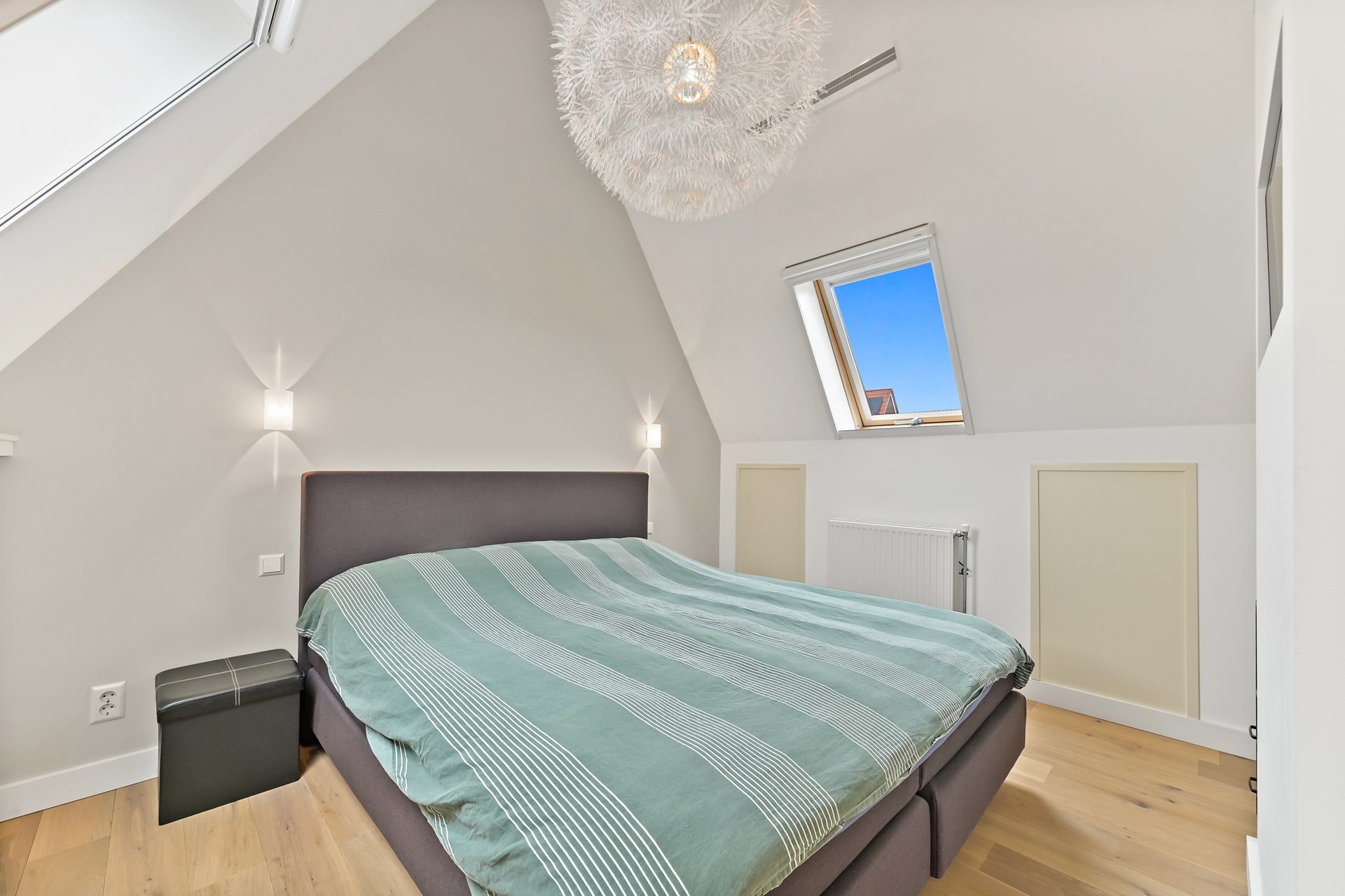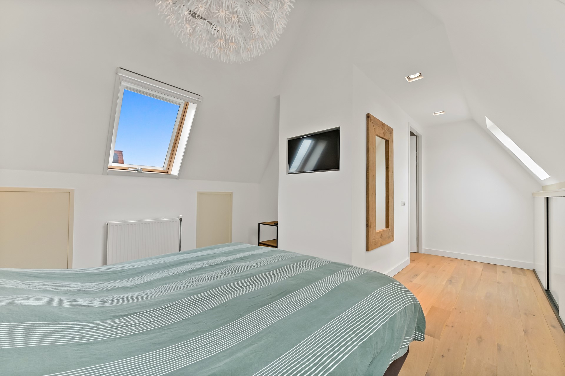 Op de zolderverdieping is de hoofdslaapkamer gerealiseerd. Deze sfeervolle ruimte is net zoals de woonverdieping voorzien van een warme houten vloer. Er zijn extra dakramen geplaatst en de hoge nok benadrukt de ruimte van deze verdieping. Er is onder de schuine delen veel praktische bergruimte. Op de overloop is een vaste bergkast waar ook de CV combiketel is opgesteld.