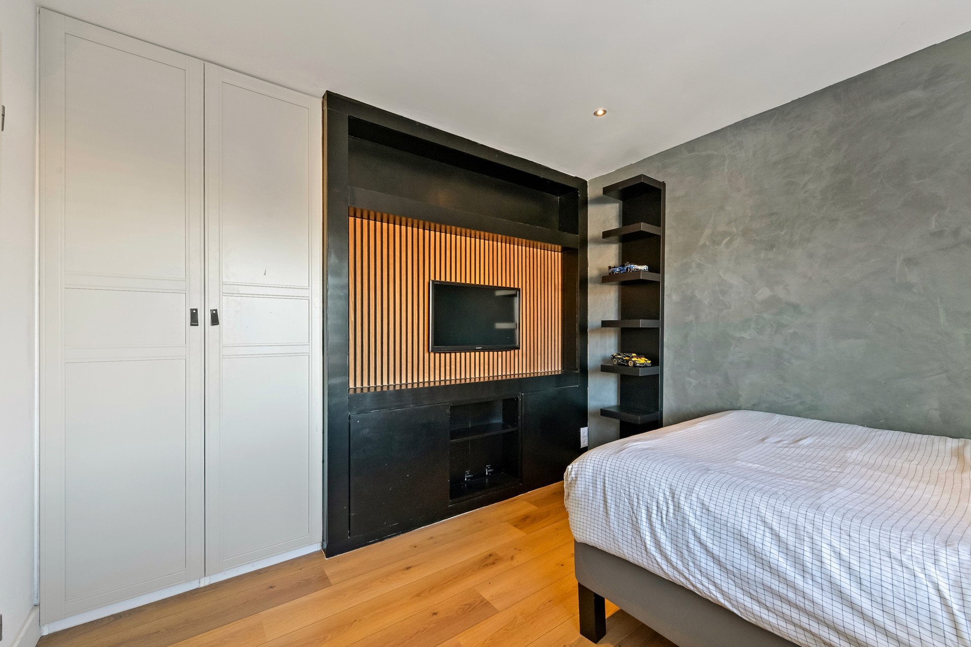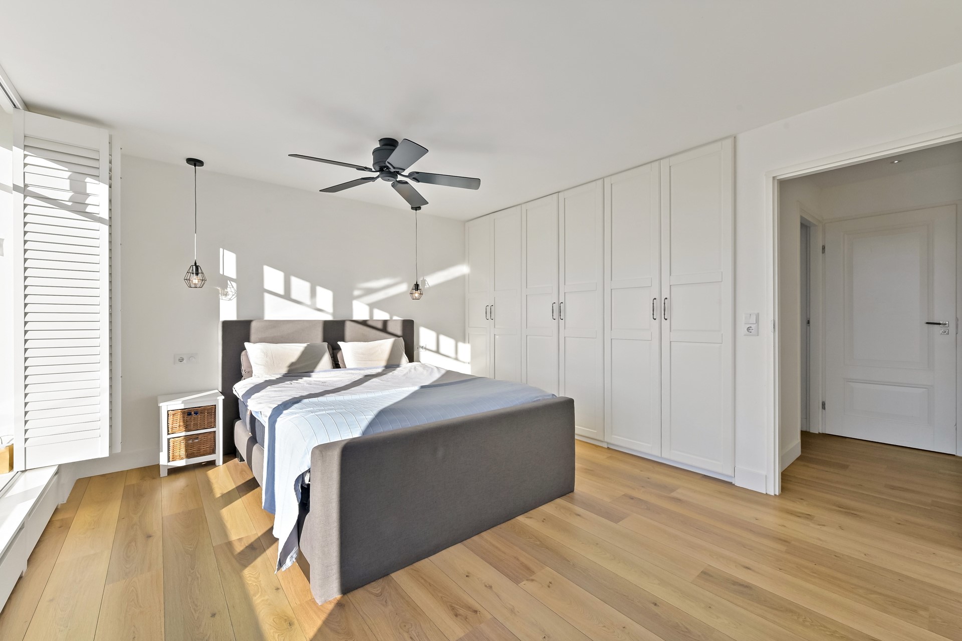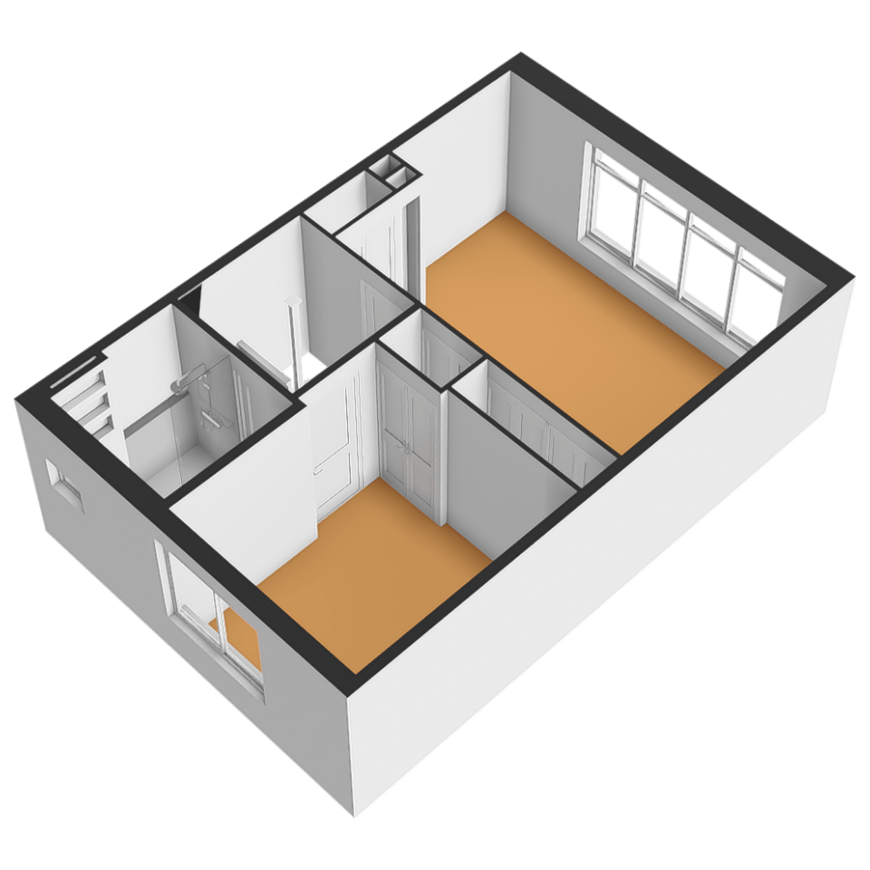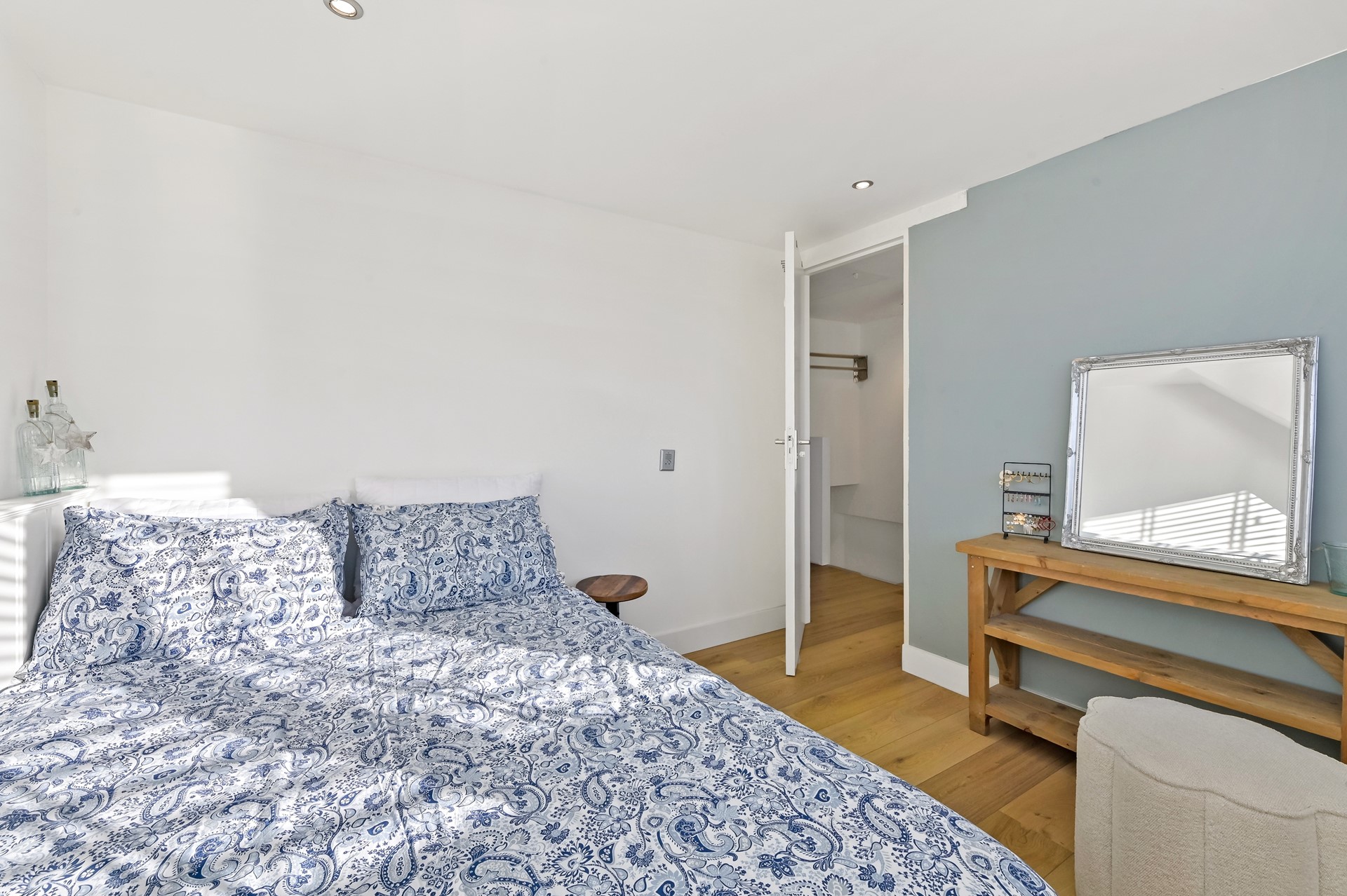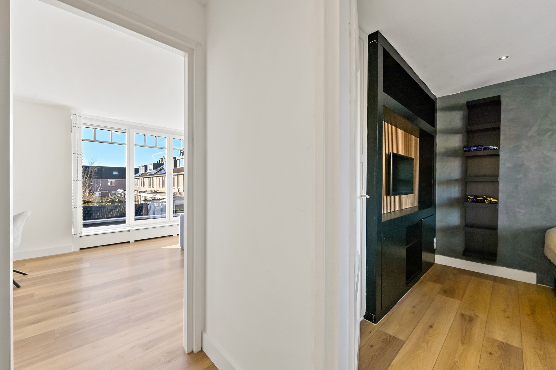 Ruime overloop met trapopgang naar de tweede verdieping en toegang tot alle vertrekken. Aan de achterzijde is een royale slaapkamer gesitueerd met vaste kasten en een grote raampartij met elektrisch bedienbare zonwering. Voorheen waren dit twee slaapkamers. De tweede slaapkamer bevindt zich aan de voorzijde van de woning. Deze kamer is eveneens voorzien van een vaste kast. Ook de luxe badkamer aan de voorzijde is compleet uitgevoerd met een wastafelmeubel, inloopdouche met rainshower en een tweede toilet.