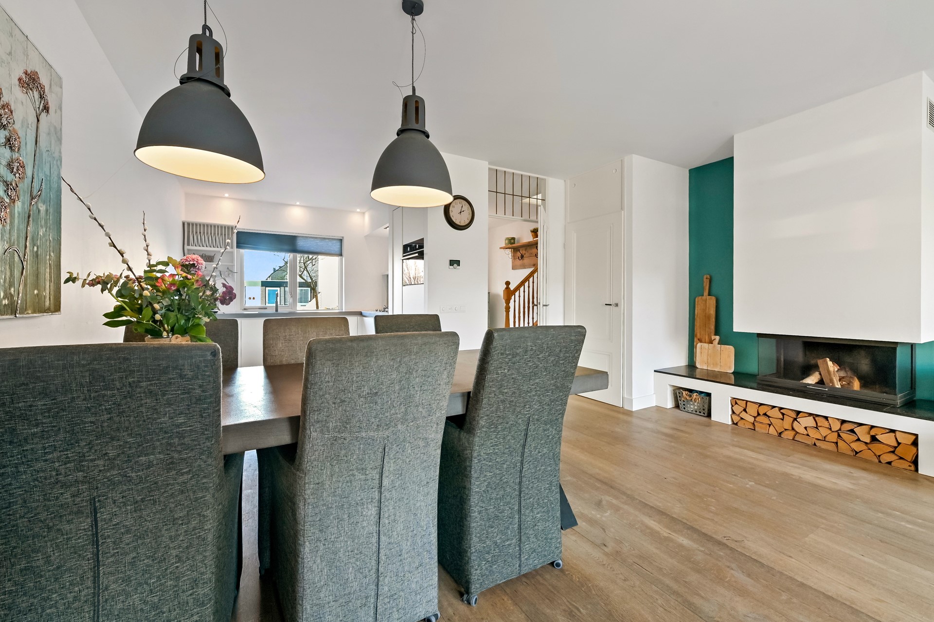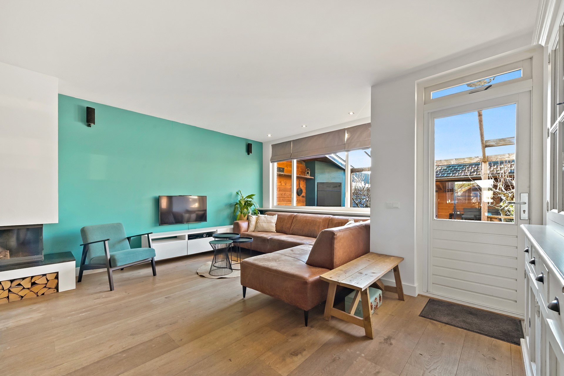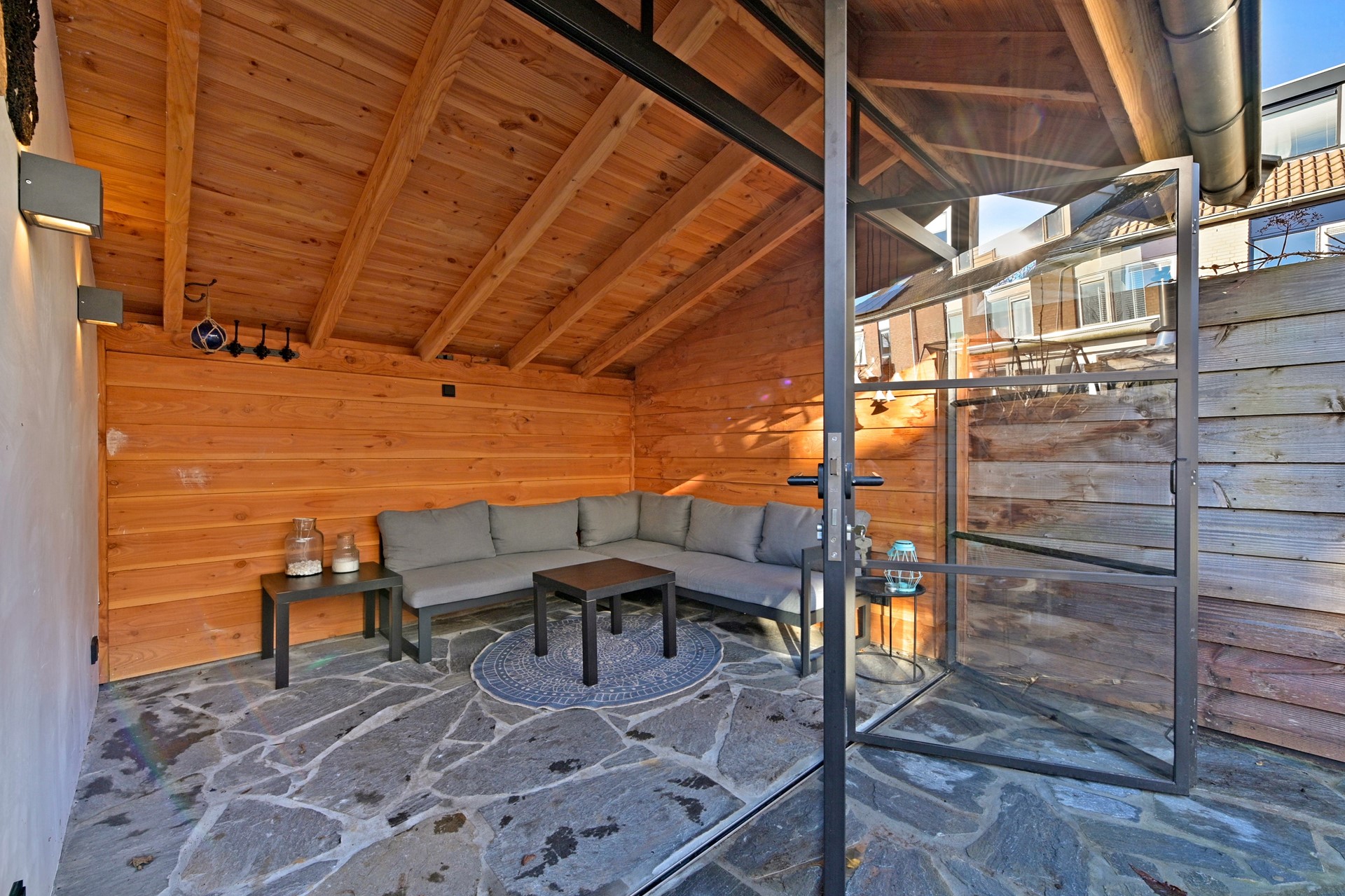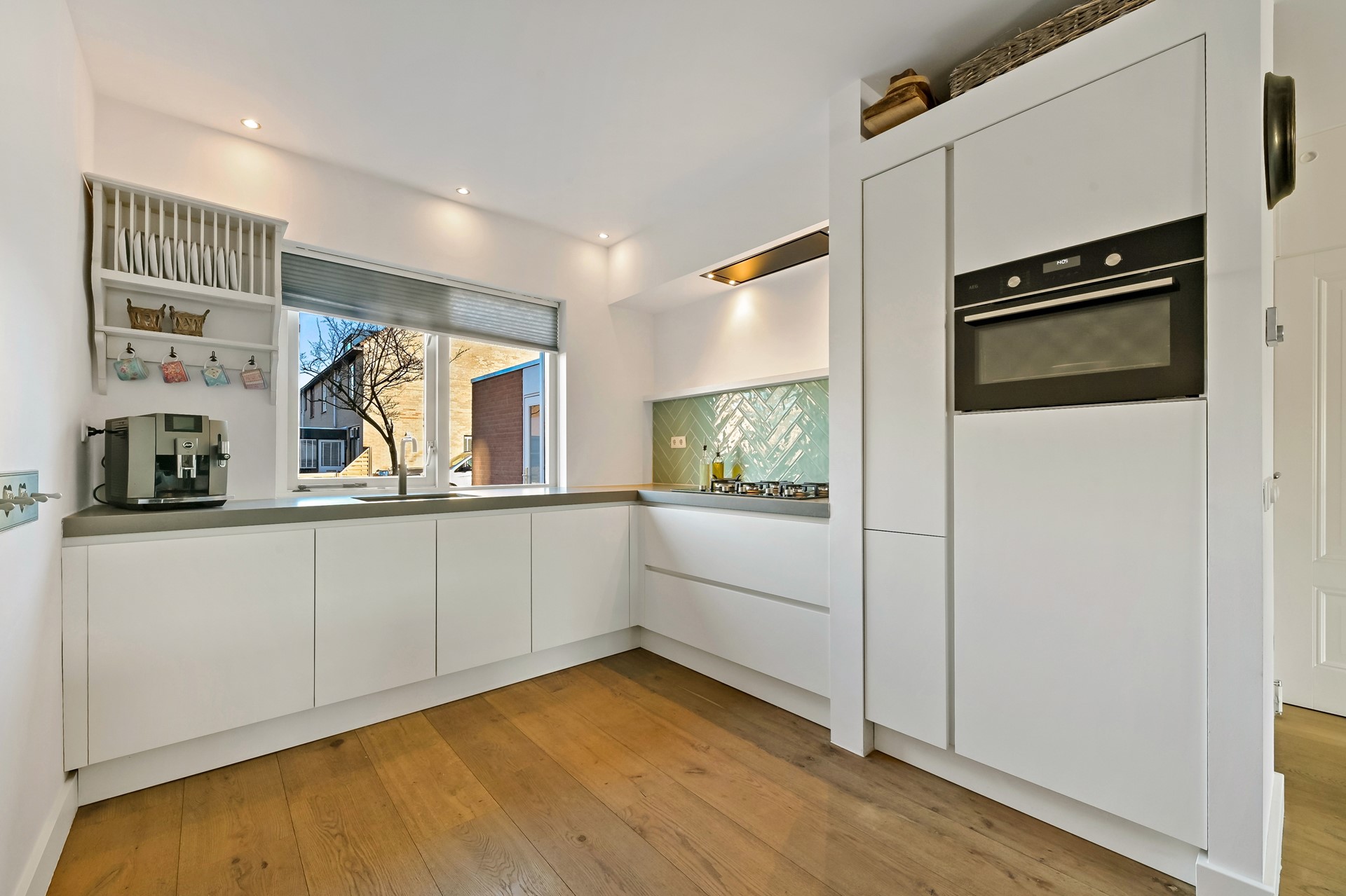 Via de voortuin bereikt u de stenen fietsenberging en de entree van de woning. De ruime hal met inpandige toegang tot de berging is voorzien van trapopgang naar de verdieping, meterkast en volledig betegelde toiletruimte, welke evenals de hal, is uitgevoerd met Portugese tegels en is voorzien van vloerverwarming. Vervolgens bereikt u de woonkamer welke is voorzien van een eiken parketvloer met vloerverwarming, een praktische trapkast en sfeervolle liftdeur-houtkachel. De erker aan de achterzijde zorgt voor extra licht in de woonkamer en een prettige verbinding met de tuin. De luxe, L-vormige keuken bevindt zich aan de voorzijde. De moderne keuken beschikt over een composiet werkblad, apothekerskast en diverse hoogwaardige inbouwapparatuur, waaronder een 5-pits gaskookplaat, plafondafzuiging, combi-oven, koelkast, vaatwasser en een Quooker met gekookt, gekoeld en bruisend water. Maar ook buiten koken behoort zondermeer tot de mogelijkheden. Direct tegen de woning is een overkapping met automatische zonwering en aangrenzende buitenkeuken met Zuid-Afrikaanse Braai gerealiseerd; ideaal voor lange zomeravonden en gezellige diners. Achterin de tuin bevinden zich een houten berging en een sfeervolle veranda met een afsluitbare glazen vouwwand, waardoor u het hele jaar door van het buitenleven kunt genieten.
