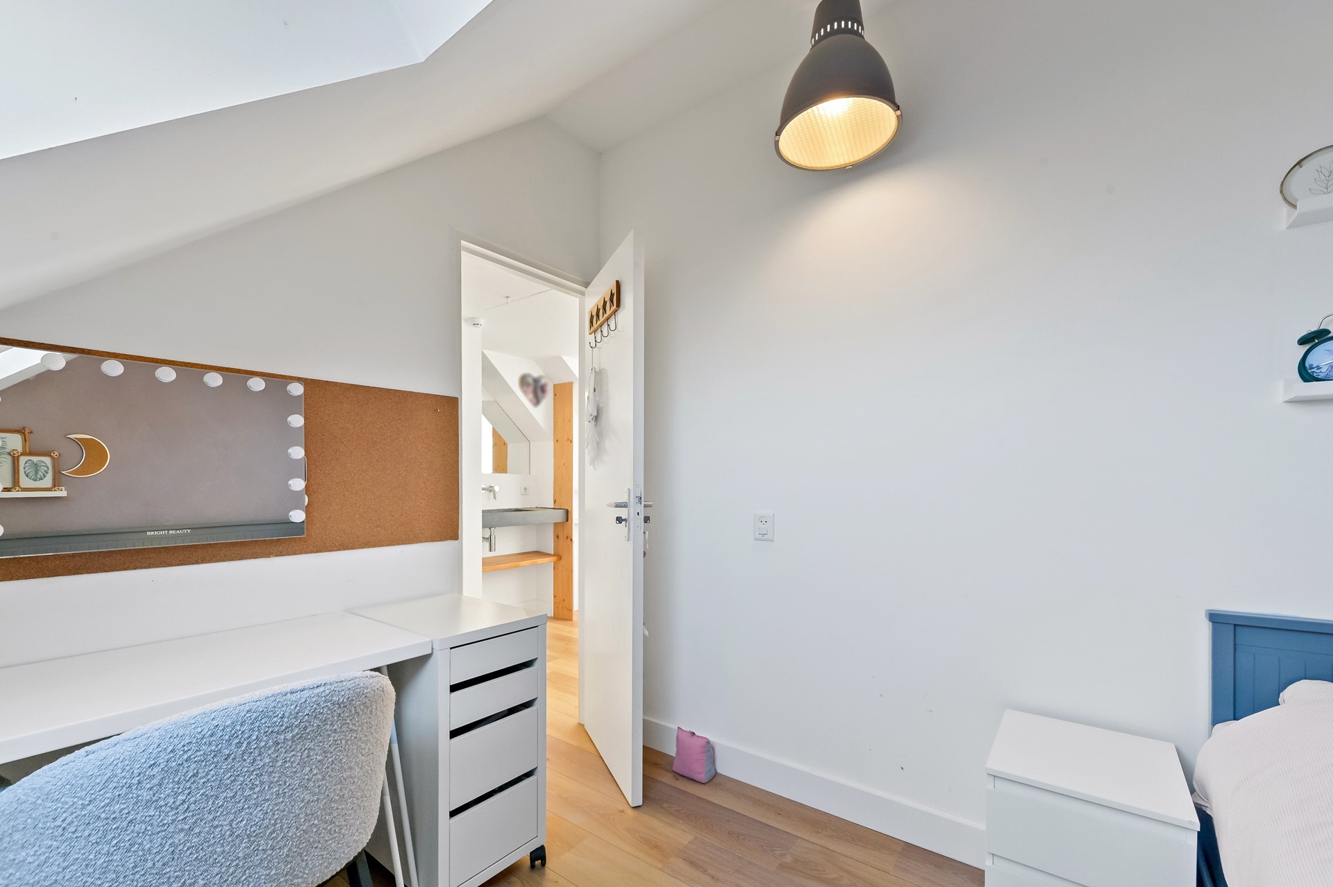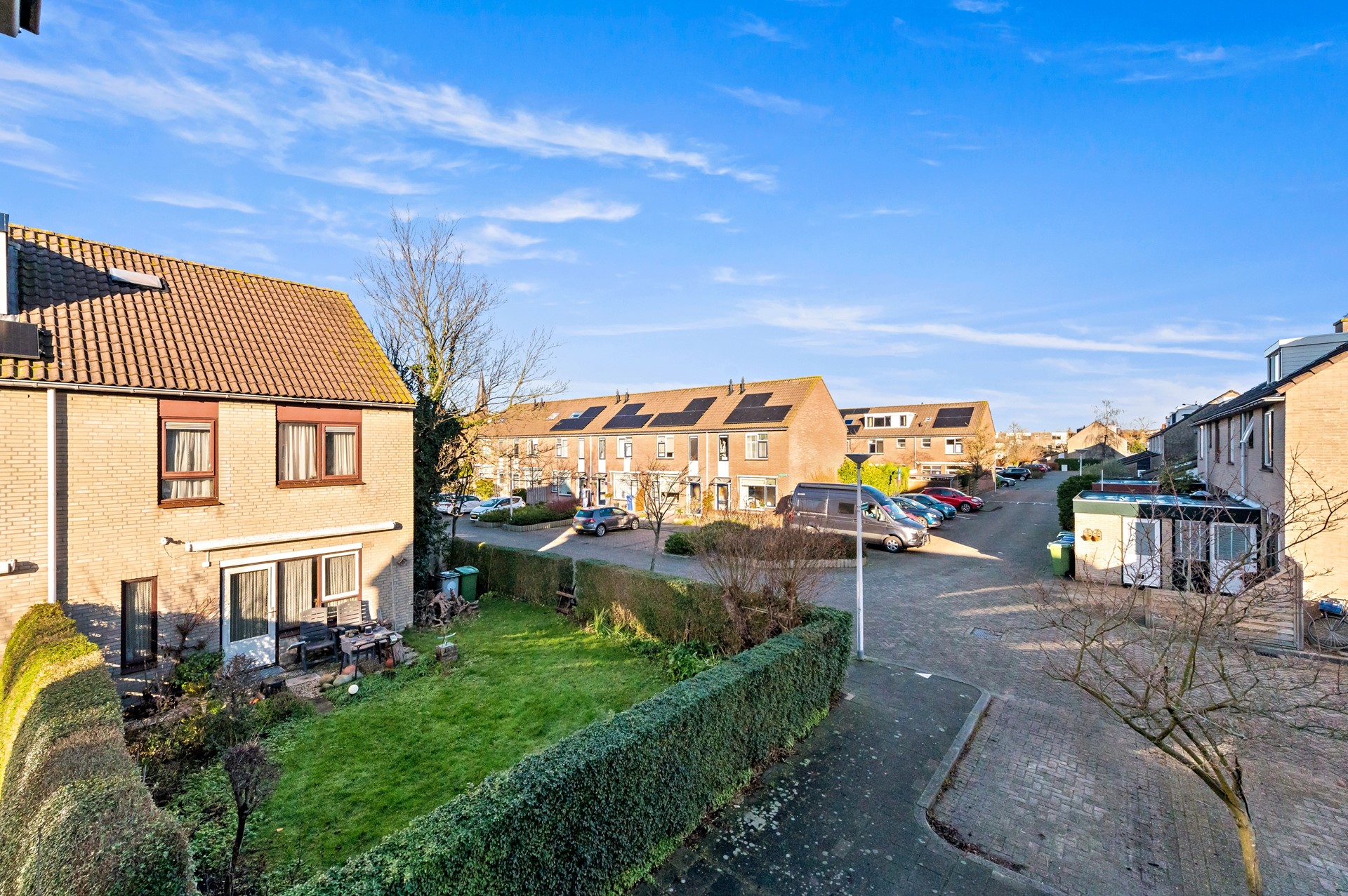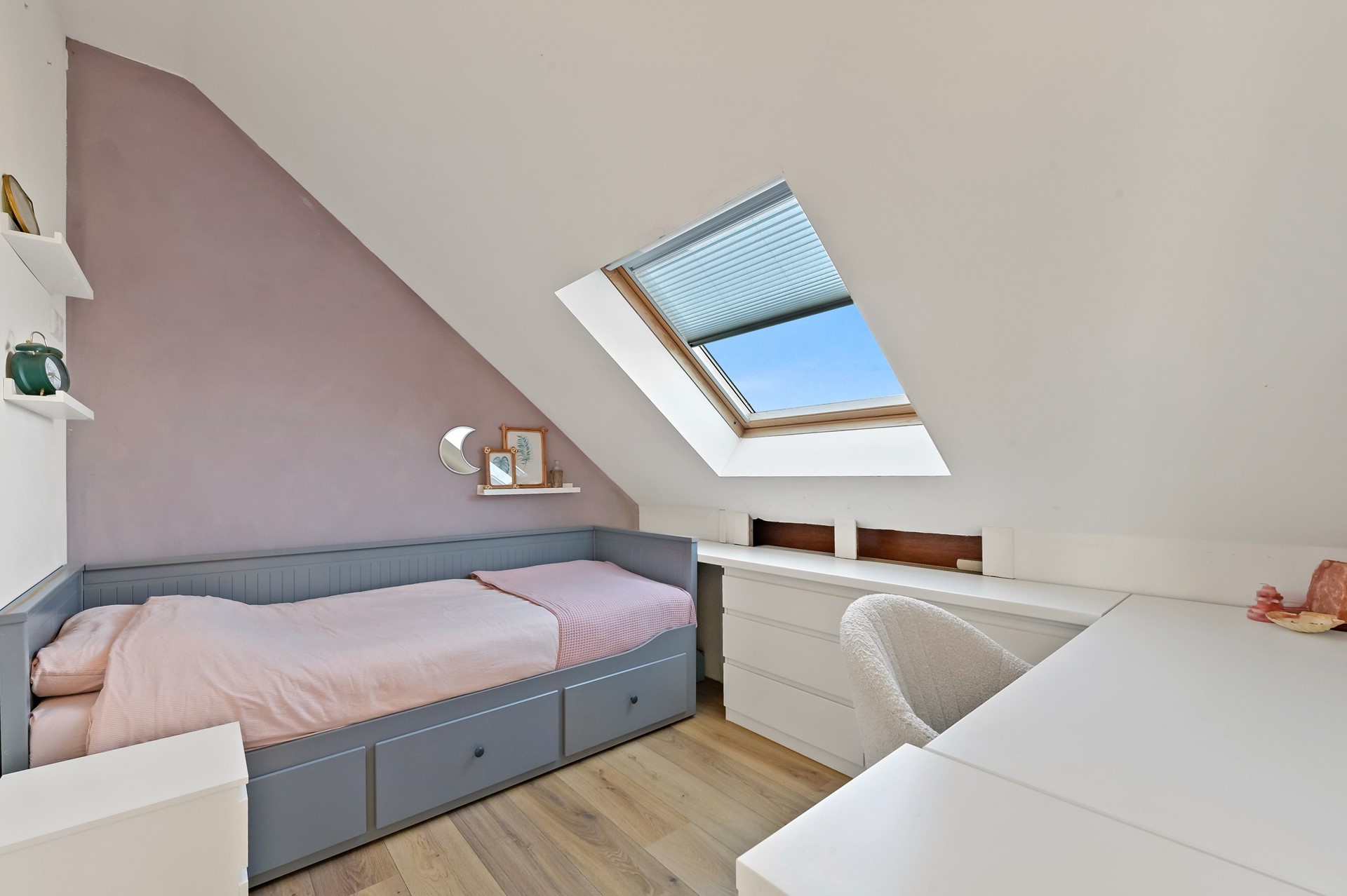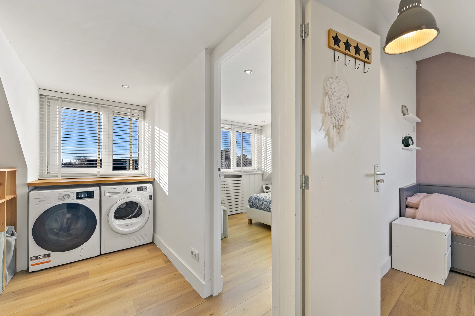De tweede verdieping biedt verrassend veel ruimte dankzij de grote dakkapel aan de achterzijde. Op de overloop vindt u een wastafel, praktische bergkasten en de opstelplaats voor wasmachine en wasdroger. Daarnaast is er via een vlizotrap toegang tot de bergvliering. Op de tweede verdieping zijn twee slaapkamers aanwezig. De slaapkamer aan de achterzijde is voorzien van dakkapel, elektrisch bedienbare zonwering en inbouwspots. De slaapkamer aan de voorzijde beschikt over een groot dakraam en is aangenaam licht.