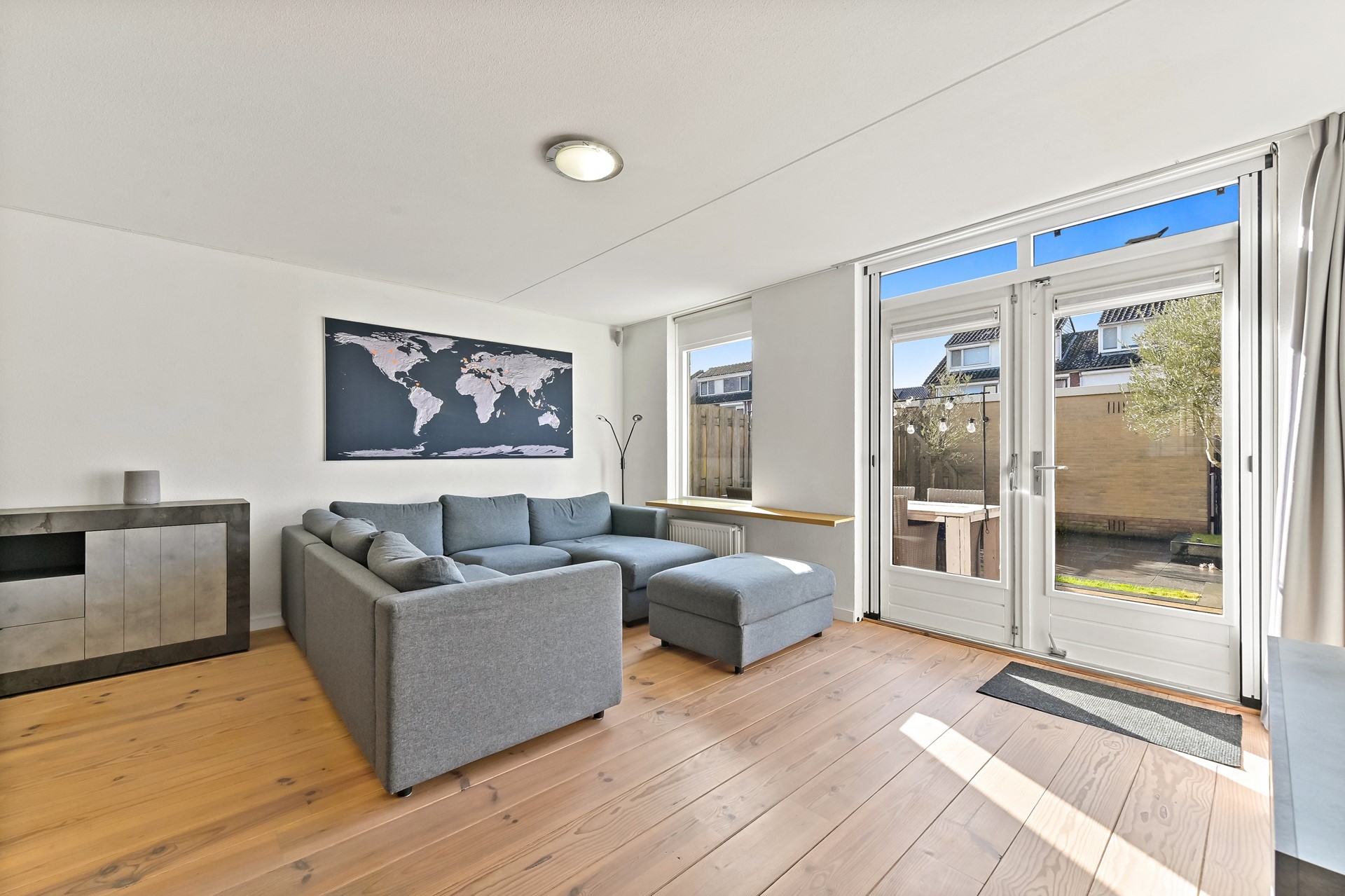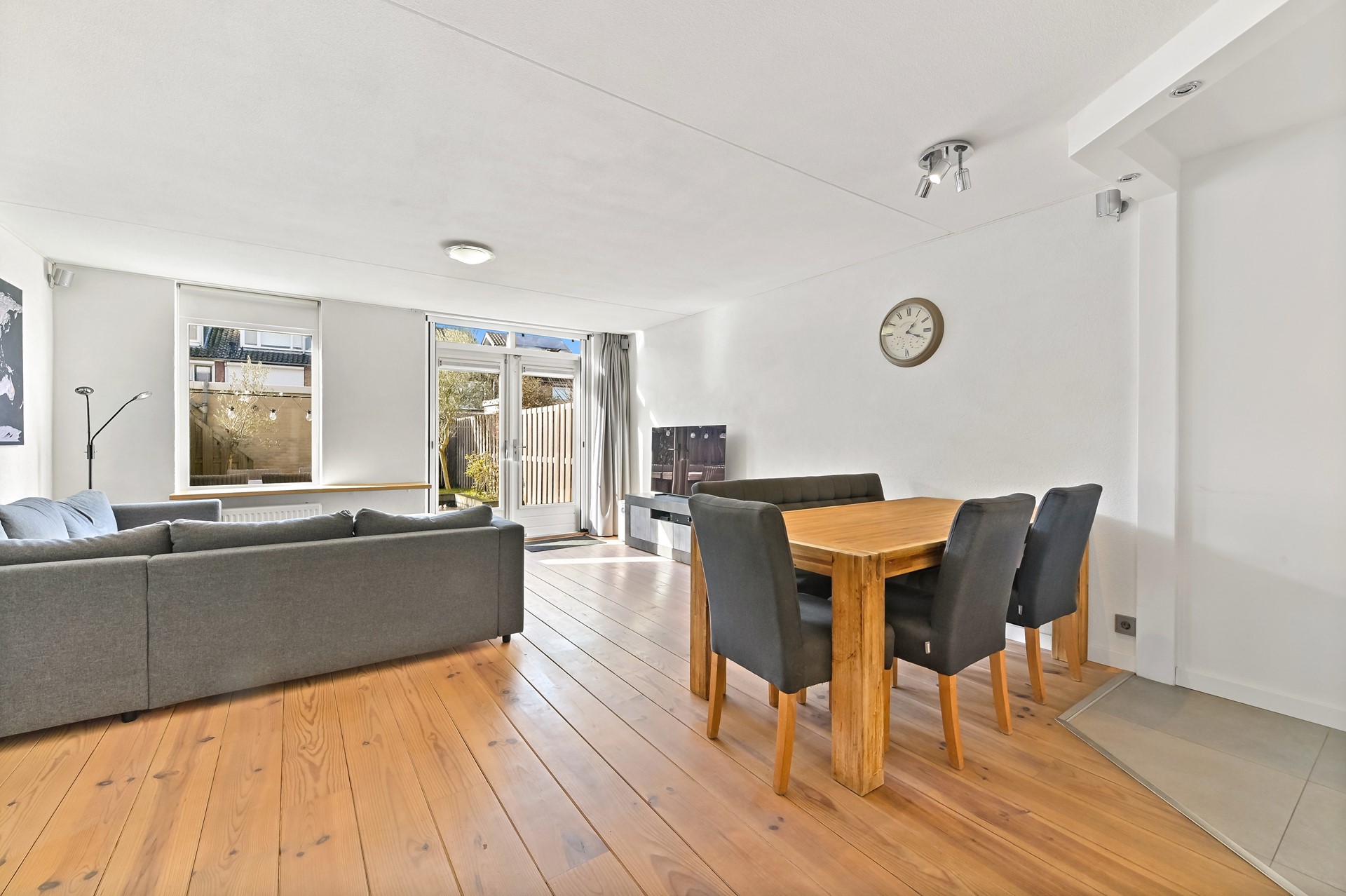 Via het autovrije voetpad aan de voorzijde bereikt u de entree van de woning. In de hal bevinden zich de meterkast, het toilet met wandcloset en fonteintje en de trapopgang naar de eerste verdieping. Vervolgens stapt u in de lichte en breed georiënteerde woonkamer. De grote raampartijen aan de achterzijde zorgen voor een prachtige lichtinval en vrij uitzicht op de fraai aangelegde achtertuin met berging en achterom. Dankzij de openslaande deuren staat de woonkamer in directe verbinding met buiten, waardoor u op zonnige dagen optimaal kunt genieten van het binnen- en buitenleven. De achtertuin is ruim 10 meter diep en gunstig gelegen op het zuidwesten, waardoor u hier volop van de middag- en avondzon geniet. In de tuin is tuinverlichting aanwezig welke functioneert met behulp van sensoren. Achterin de tuin staat een stenen berging waar u met gemak de fietsen van het gehele gezin kunt stallen. De woonkamer is ruim en praktisch ingedeeld en beschikt over een trapkast voor extra bergruimte. Aan de voorzijde van de woning bevindt zich de moderne keuken in parallel opstelling met verdiept aanrechtblad en aangrenzende bar. De keuken is enkele jaren gelegen volledig gerenoveerd en stijlvol afgewerkt. Naast de diverse opbergmogelijkheden is de keuken voorzien van hoogwaardige inbouwapparatuur waaronder een koel-vrieskast, vaatwasser, Bora inductiekookplaat met geïntegreerde afzuiging, combi-oven en spoelbak met Quooker. Kookfanaten kunnen hier met veel plezier aan de slag!