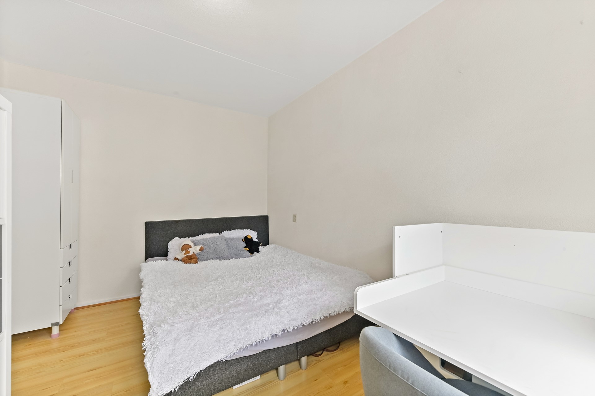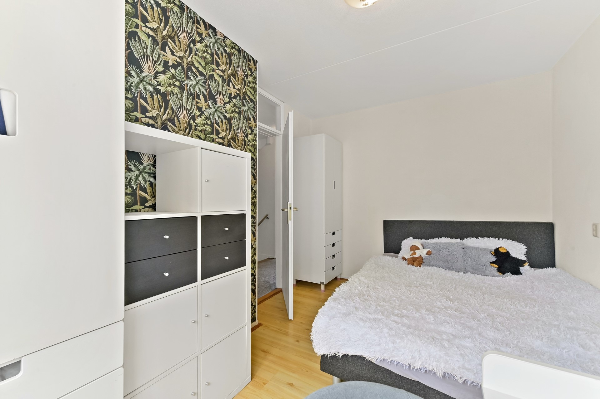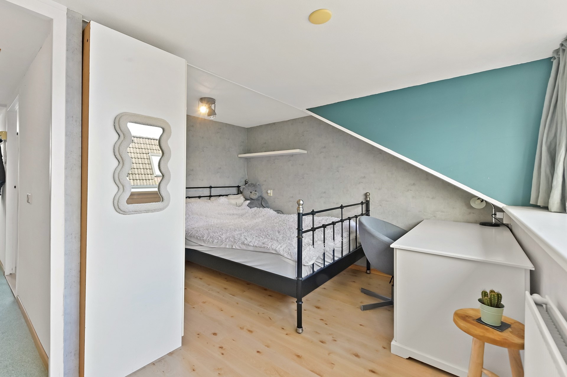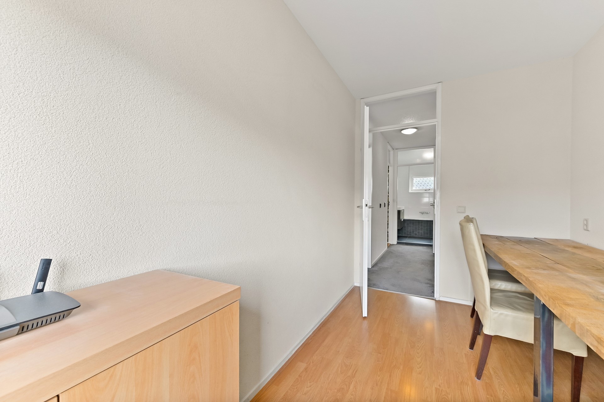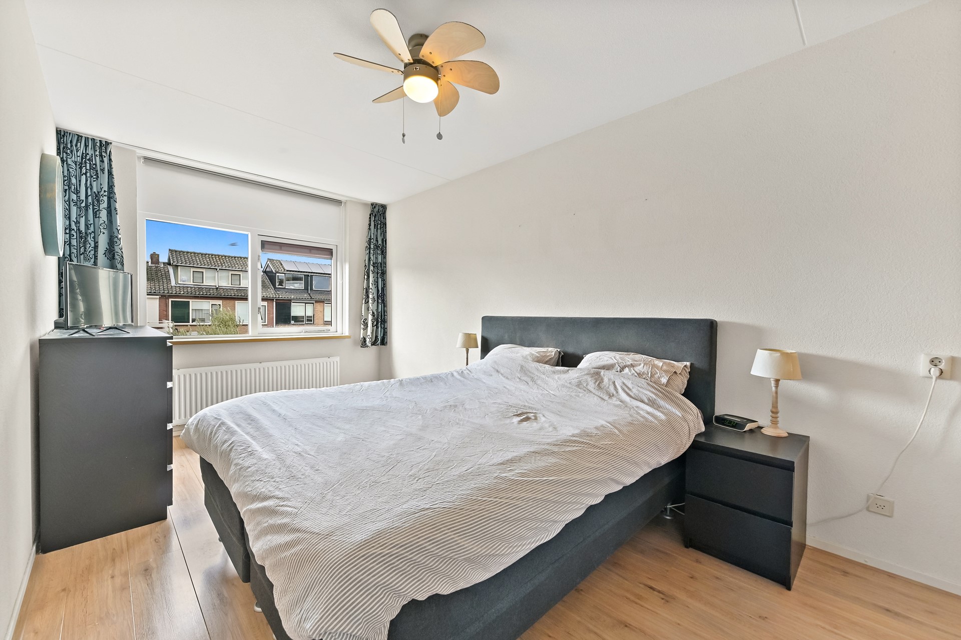 Vanaf de overloop heeft u toegang tot de drie slaapkamers, het separate toilet en de badkamer. Aan de achterzijde van de woning bevinden zich twee slaapkamers. De hoofdslaapkamer is ruim van opzet en beschikt over een vaste kastenwand wat zorgt voor praktische opbergruimte. De tweede kamer is eveneens ruim van formaat en wordt op dit moment gebruikt als kantoor. De derde slaapkamer is aan de voorzijde van de woning te vinden. Deze kamer is ruim van formaat en praktisch ingedeeld. Direct daarnaast ligt de nette, volledig betegelde badkamer. Deze is uitgerust met een wastafelmeubel, ligbad en douchecabine. Dankzij het raam in de voorgevel is er prettig daglicht en natuurlijke ventilatie aanwezig.