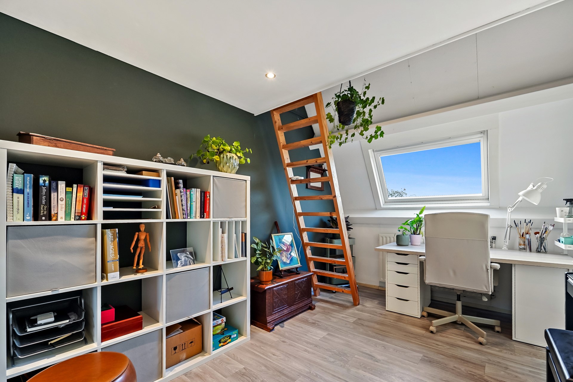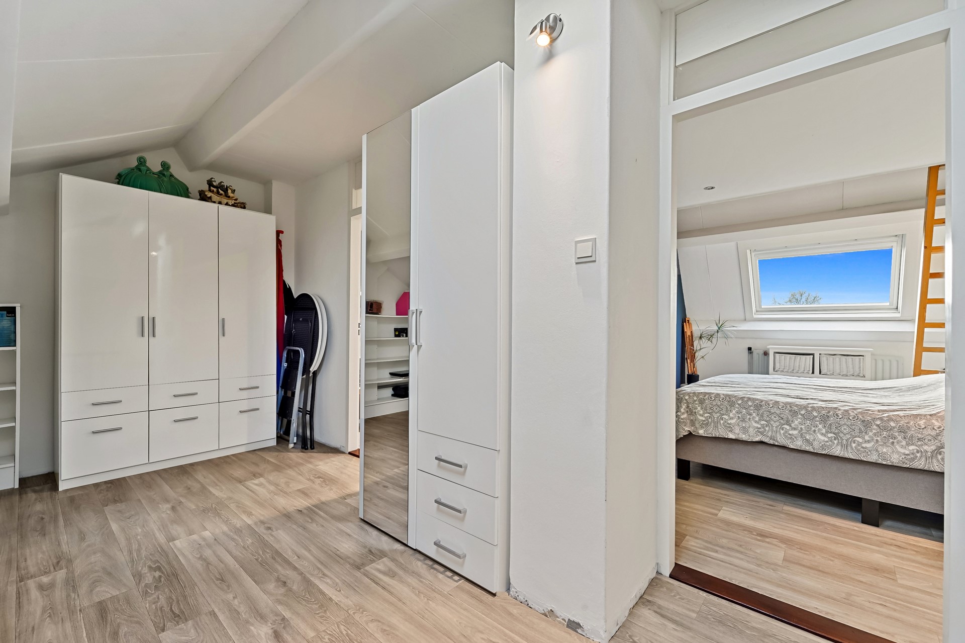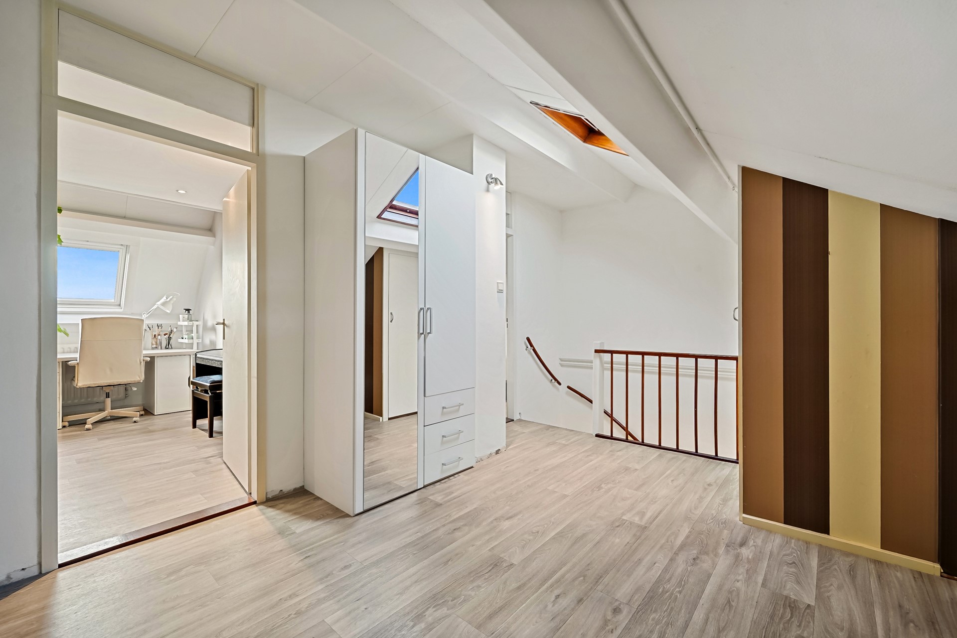 De tweede verdieping van deze woning is echt een volwaardige verdieping met twee grote slaap- annex werkkamers en een overloop met veel bergruimte. Beide slaap-/werkkamers beschikken over een Velux dakraam en dankzij de hoge nok van deze woning is de vide optimaal benut. Dankzij de vaste trappen zijn hier leuke slaapruimtes van gemaakt. Er is veel bergruimte onder het schuine gedeelte aan de achterzijde van de woning.