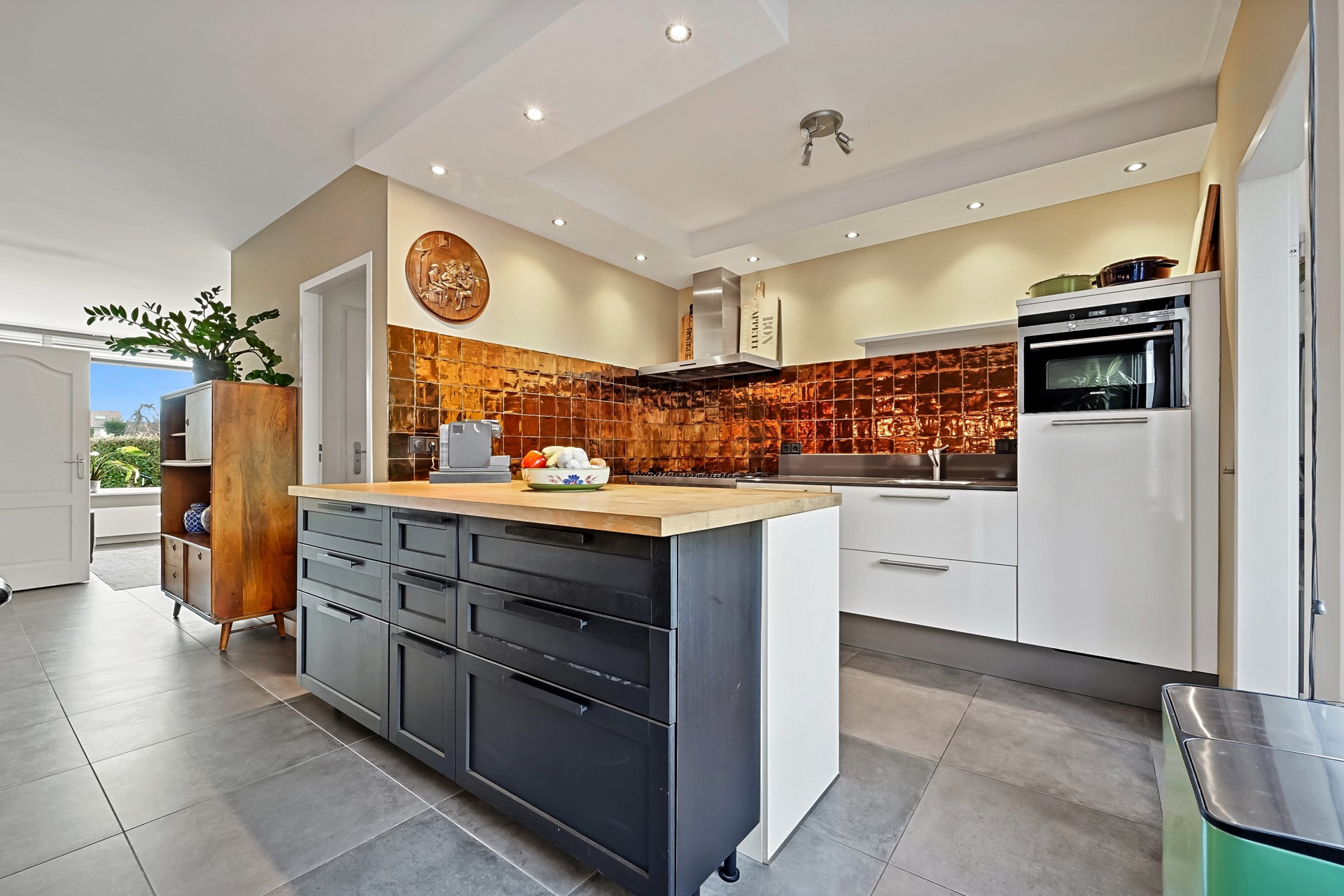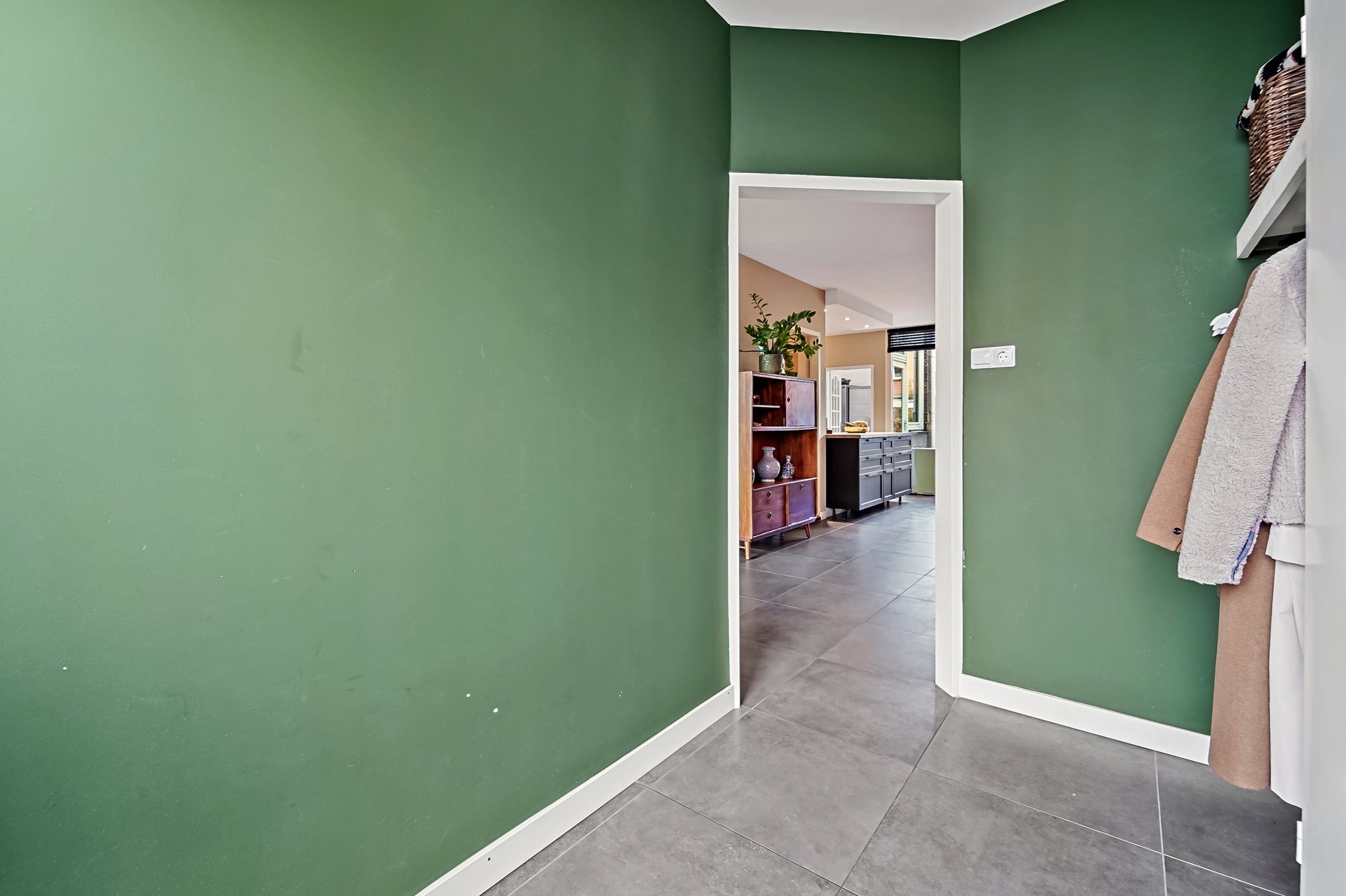 Voortuin met veel groen en ruimte. Entree van de woning. Brede hal met meterkast en garderoberuimte. De woonverdieping is U-vormig met de centrale hal in het midden. Aan de voorzijde is momenteel een grote woonkamer met zithoek waar het heerlijk ontspannen is. Aan de achterzijde is de grote woonkeuken. Vanuit deze ruimte is direct de fijne achtertuin bereikbaar via de dubbele deuren. De moderne keuken is praktisch ingericht en beschikt over diverse inbouwapparatuur. Achter de keuken is de bijkeuken. In de bijkeuken zijn aansluitingen voor wasmachine en droger aanwezig. De achtertuin is ook vanuit de bijkeuken bereikbaar. De achtertuin is t.o.v. de andere woningen in de rij extra diep. Er is een stenen berging en een achteruitgang aanwezig. Centraal op de woonverdieping is de tussenhal met toilet en trap naar de overige verdiepingen. De woonverdieping is geheel voorzien van een comfortabele vloerverwarming. De wanden en plafonds zijn strak gestuct.