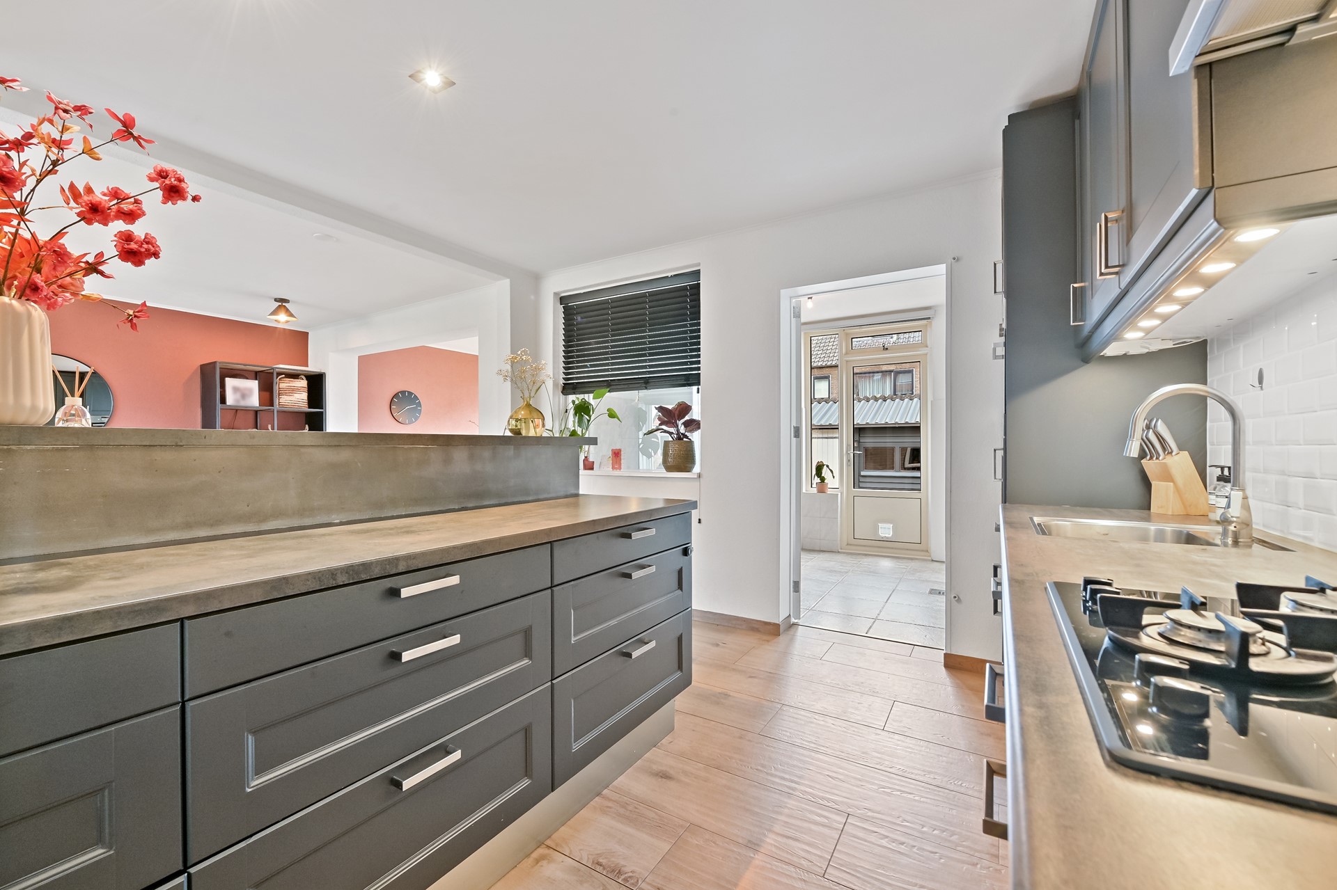 Aan de voorzijde is de woning langs een groenstrook gelegen, zodat je altijd een vrij uitzicht hebt. Via de ruime voortuin stap je de woning binnen in een nette hal. Hier vind je de trapopgang, de meterkast en het toilet. De toiletruimte aan de voorzijde is netjes afgewerkt en voorzien van een wandcloset. Vanuit de hal is de lichte woonkamer met open keuken bereikbaar. Bij binnenkomst valt direct de enorme breedte op. De woonkamer is aan de achterzijde uitgebouwd waardoor hier extra leefruimte is ontstaan. Naast de uitgebouwde woonkamer bevindt zich een praktische bijkeuken met aansluitingen voor de wasmachine en droger. De bijkeuken biedt toegang tot de achtertuin, maar ook vanuit het eetgedeelte is de achtertuin via de dubbele deuren te bereiken. Aan de voorzijde is een grote raampartij aanwezig waardoor er veel daglicht naar binnen schijnt. De afwerking is bovendien stijlvol; met o.a. diverse inbouwspots en vloerverwarming is dit een fijne en aangename ruimte die sfeervol in te delen is. De open moderne keuken bevindt zich in het midden van de woning. De keuken met schiereiland is in parallelopstelling geplaatst en voorzien van diverse inbouwapparatuur waaronder een vier pits gaskookplaat, RVS afzuigkap, vaatwasser, combi-oven en koelkast. Door deze opstelling is er extra veel werkruimte in de keuken aanwezig. De handige bergkast onder de trap is vanuit de keuken bereikbaar. De bijkeuken en woonkamer bieden beide toegang tot de zonnige achtertuin met grote berging van maart liefst 13 m2 en achterom. Ook hier valt de breedte direct op. De tuin is verzorgd aangelegd en biedt alle ruimte voor een comfortabele loungeset én een grote eettafel. Hier geniet je tot in de late uurtjes van de zon. Aan de achtergevel van de woning is een buitenkraan en dubbel zonnescherm gemonteerd.