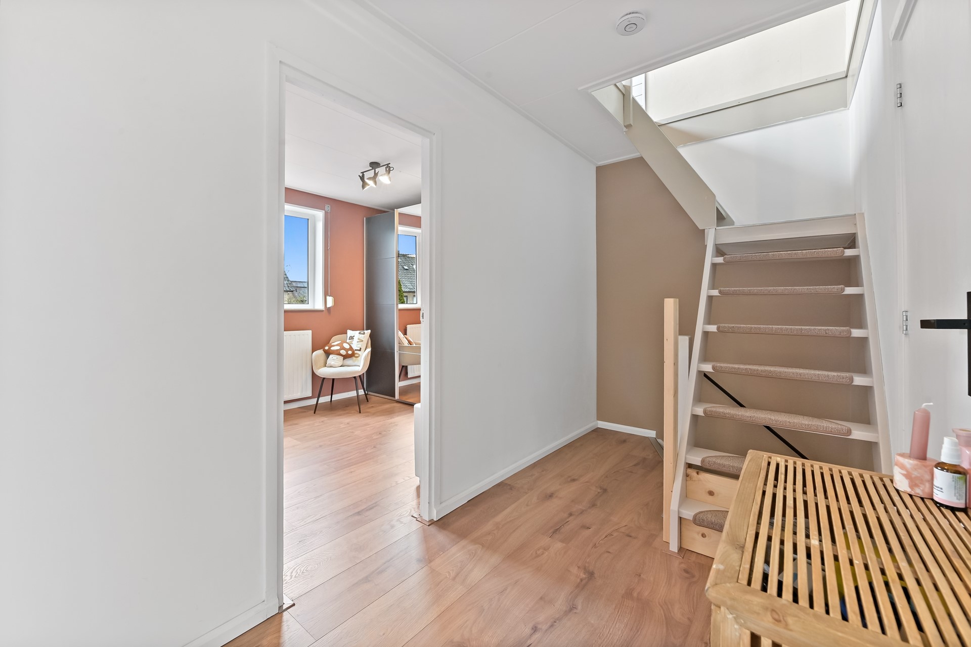 Dankzij de nokverhoging is ook de tweede verdieping verrassend ruim en volledig bruikbaar. De royale overloop biedt toegang tot de bergkast en vierde slaapkamer; ideaal te gebruiken als tienerkamer, werkruimte of logeerkamer. Met knieschotten heb je bovendien meer dan genoeg bergruimte.