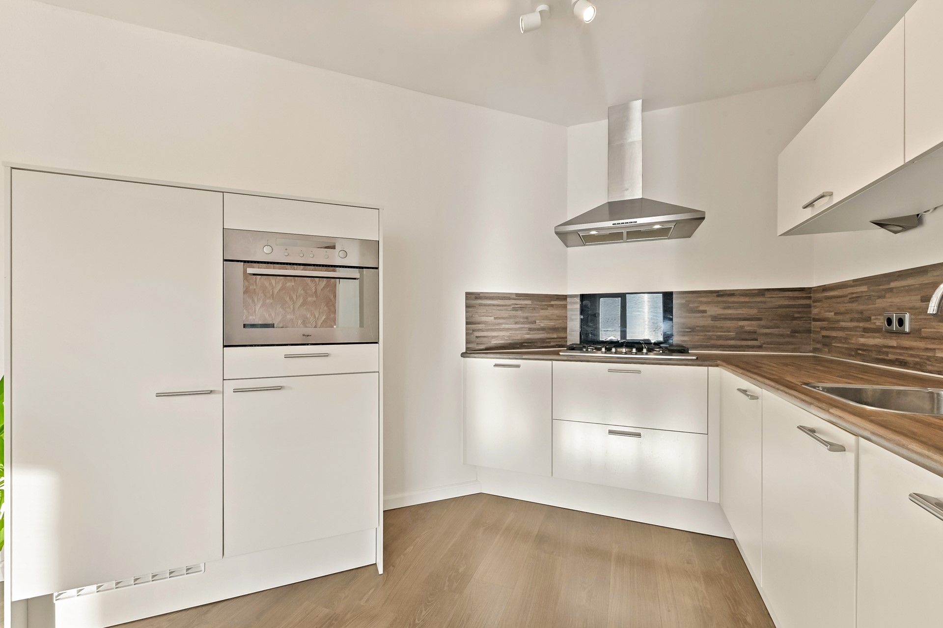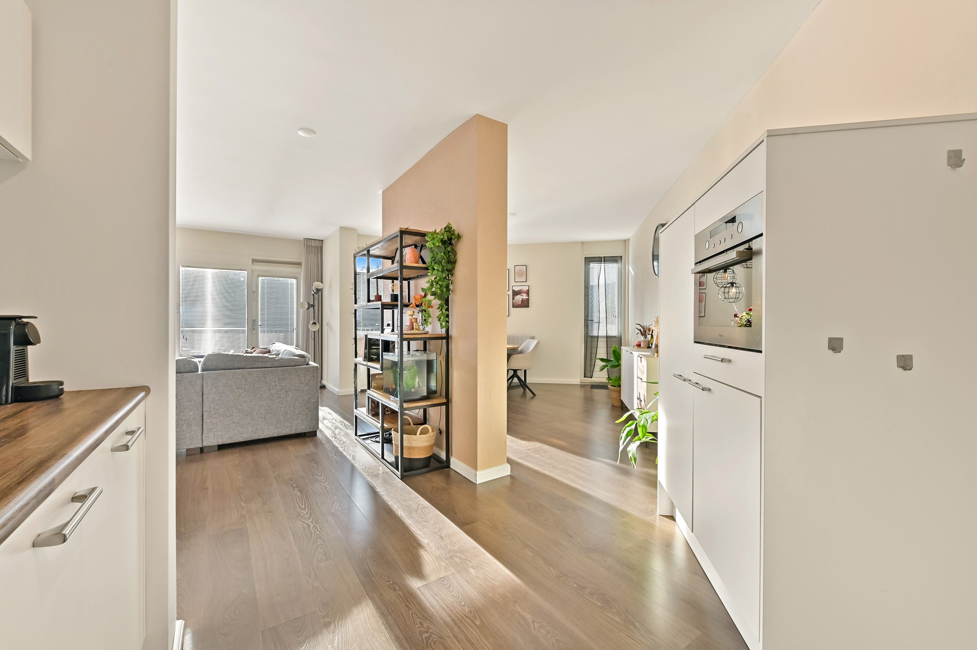 Via de galerij kom je bij de entree van de woning met hal, geheel betegelde toiletruimte met zwevend toilet en fonteintje. De ruime en lichte woonkamer, fraaie laminaatvloer en grote bergkast onder de trap is dankzij de waaiervorm verrassend sfeervol ingedeeld. Vanuit de woonkamer is het eerste dakterras bereikbaar over de gehele breedte van het zitgedeelte. Aan de buitenzijde zijn elektrische zonwerende screens (2021) geplaatst. Het tweede terras is bereikbaar vanuit de eetkamer. Dit verrassend ruime terras op het zuiden, met vrij uitzicht over de historische kern van Maasland, is voorzien van een mooie houten terrasvloer. Door de afmetingen kun je dit dakterras sfeervol inrichten. Aan de voorzijde van het appartement staat de moderne open keuken opgesteld in een U-vorm met diverse inbouwapparatuur waaronder een vaatwasmachine, koel- vriescombinatie (2021), 4-pits gaskookplaat met aparte wok brander, RVS-afzuigkap en combi-oven magnetron. De keuken is uitgevoerd in een lichte kleurencombinatie.