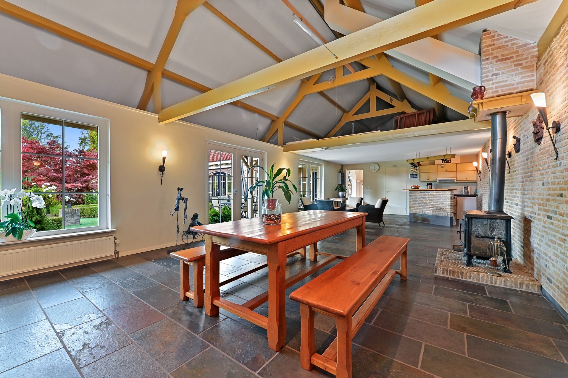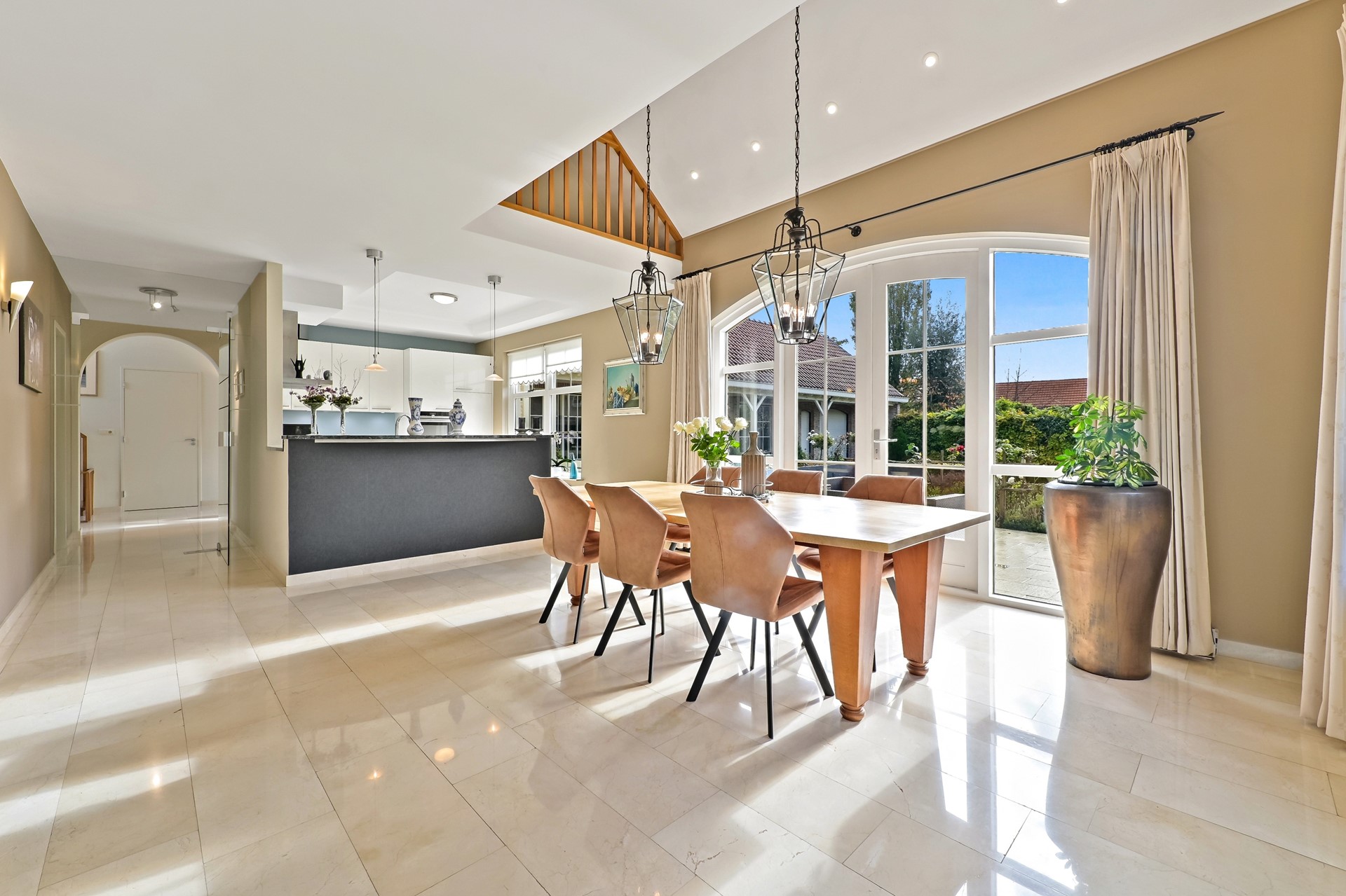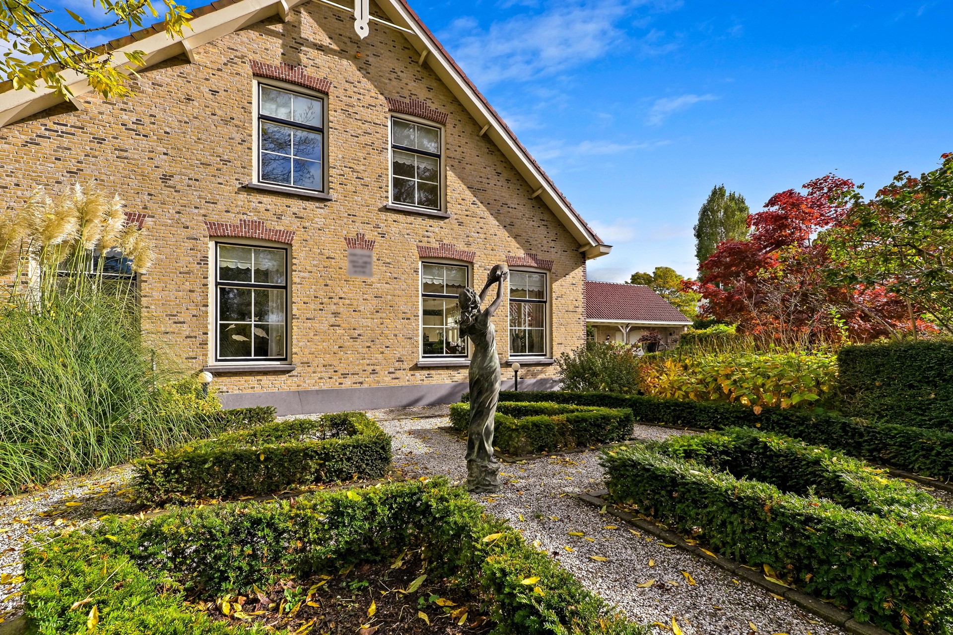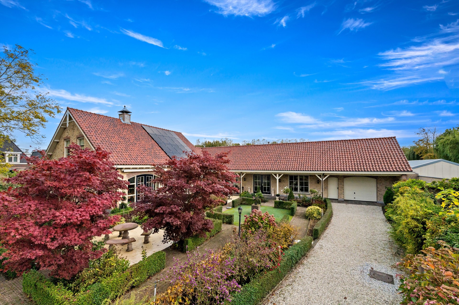 Via de eigen oprijlaan en verzorgd aangelegde tuin bereikt u de woning. Bij binnenkomst in de woning valt direct de unieke architectuur en royale opzet op. De woning is ontworpen met oog voor licht, zichtlijnen en ruimtelijkheid. Centraal in de woning bevindt zich het imposante trappenhuis, dat niet alleen functioneel is maar ook als architectonisch middelpunt fungeert en de verschillende vleugels van de woning met elkaar verbindt. Onder de trap is een inpandige vijver met Koikarpers aanwezig. Grenzend aan de hal bevindt zich de toiletruimte met wandcloset en fonteintje. Via de linkerzijde komt u in de royale woonkamer over de volledige breedte van de woning met open keuken. De in 2018 geplaatste keuken is luxe en voorzien van diverse inbouwapparatuur. Vanuit de woonkamer is de prachtige tuin met zonnig terras op het zuiden te bereiken via dubbele openslaande deuren. Met diverse grote ramen in de gevel komt er veel licht binnen. De woonkamer is voorzien van een lichte vloertegel met vloerverwarming en een gestukt plafond. In het zitgedeelte is een gasgestookte haard aanwezig met maatwerk kastenwand. Boven het eetgedeelte bevindt zich een fraaie vide, waardoor u nog meer ruimte en licht in het woongedeelte ervaart. De hoofdslaapkamer en badkamer zijn op de begane grond gelegen. De badkamer is luxe uitgevoerd en voorzien van een riante inloopdouche met sunshower en tweede toilet.. Vanuit de slaapkamer heeft u toegang tot de beschutte achtertuin. Via de hal komen we in het andere deel van de woning. Hier is de bijkeuken annex wasruimte van waar de achtertuin ook bereikbaar is. Via het achterpad is een extra berging te bereiken. De multifunctionele ruimte, welke veelal gebruikt is voor bijeenkomsten, feesten en partijen kan op diverse manieren in gebruik genomen worden. Er is zelfs een tweede badkamer met doucheruimte en toilet aanwezig. De open kap, met prachtige spantconstructie in het zicht, een open keuken en twee vides met bergruimte is voorzien van een warme plavuizen vloer met vloerverwarming. Centraal in de ruimte bevindt zich de houtkachel en via de dubbele deuren en meerdere raampartijen heeft u zicht op de sierlijke tuin. Naast de ruimte bevindt zich de inpandige, geïsoleerde garage met water en verwarming. De garage is afgesloten met een loopdeur en een elektrische overheaddeur.