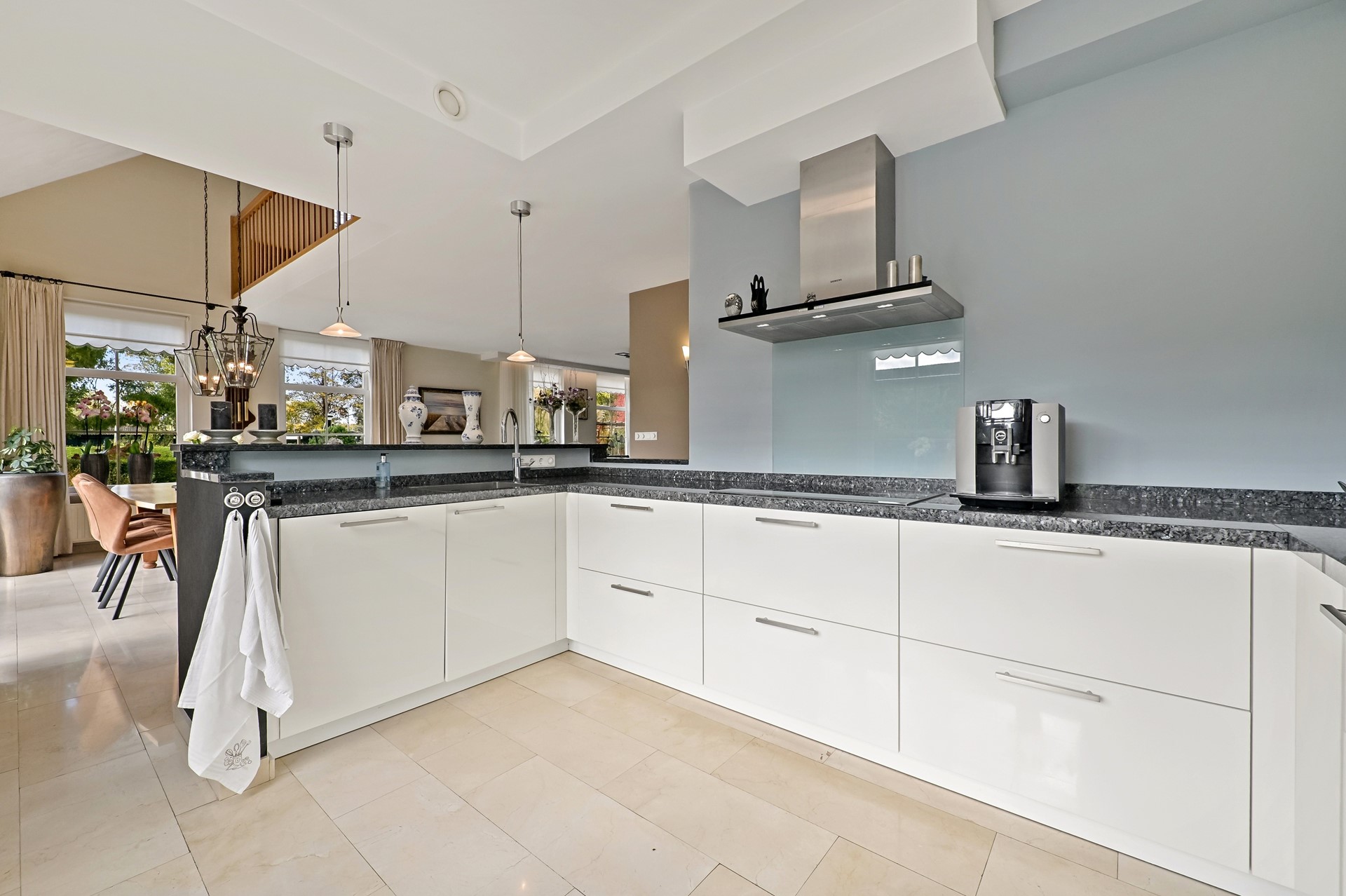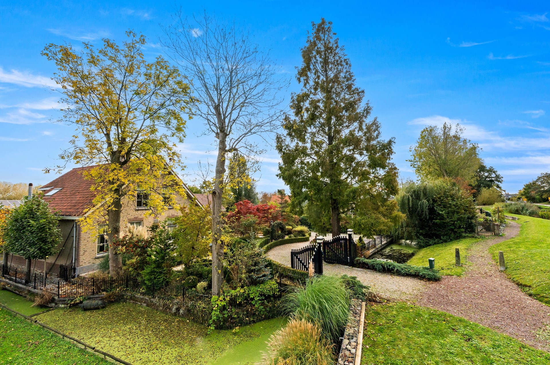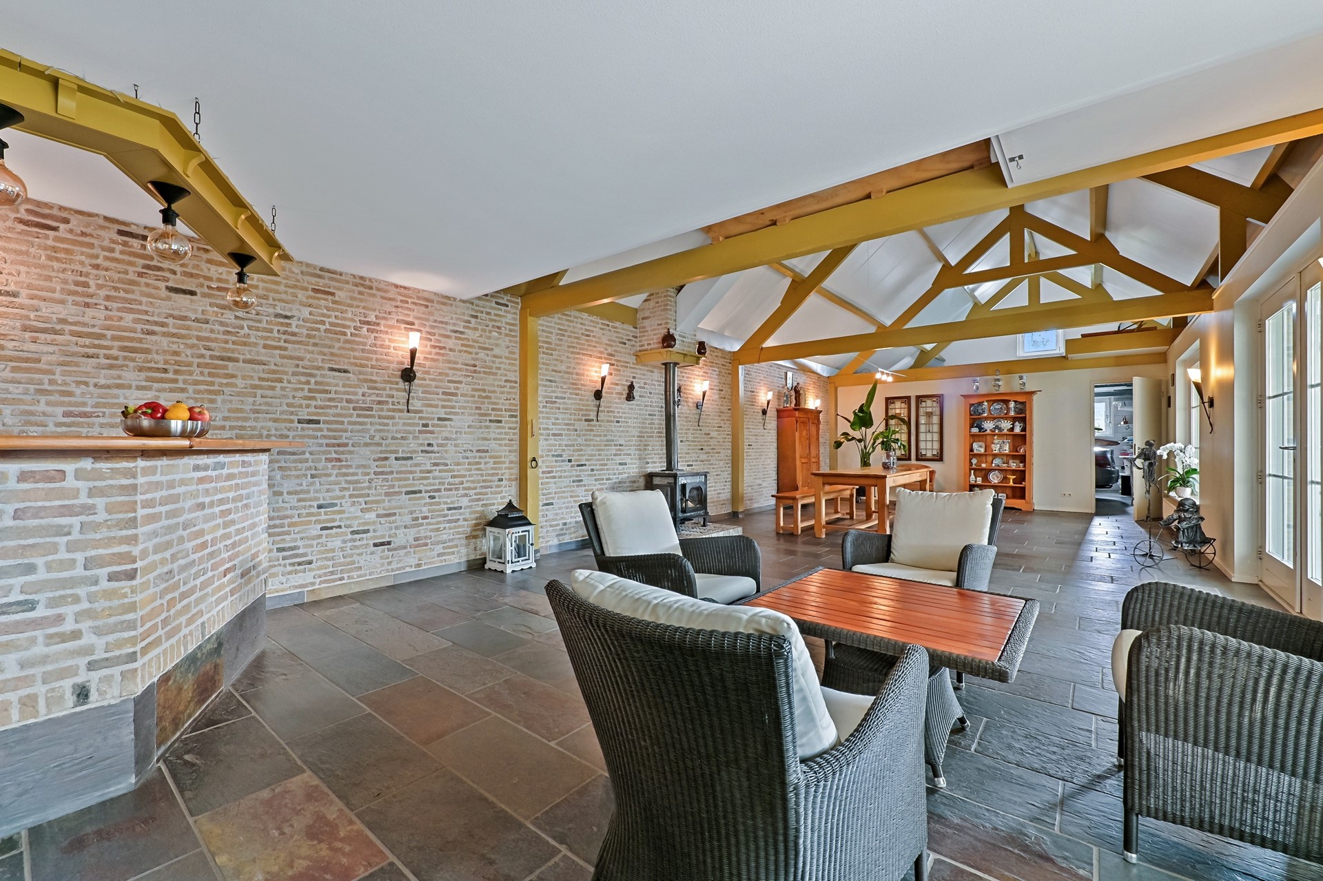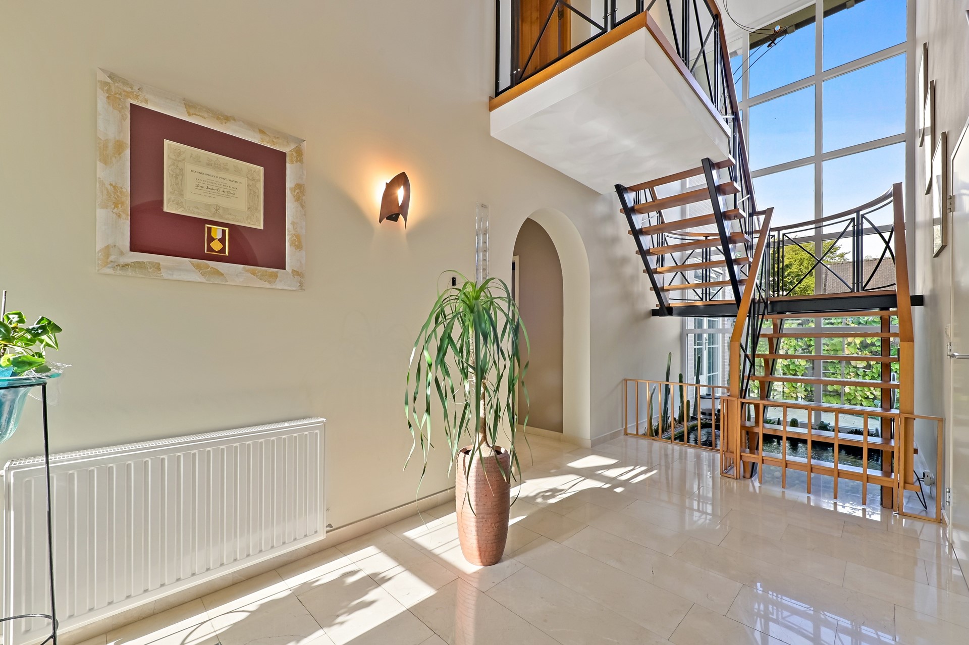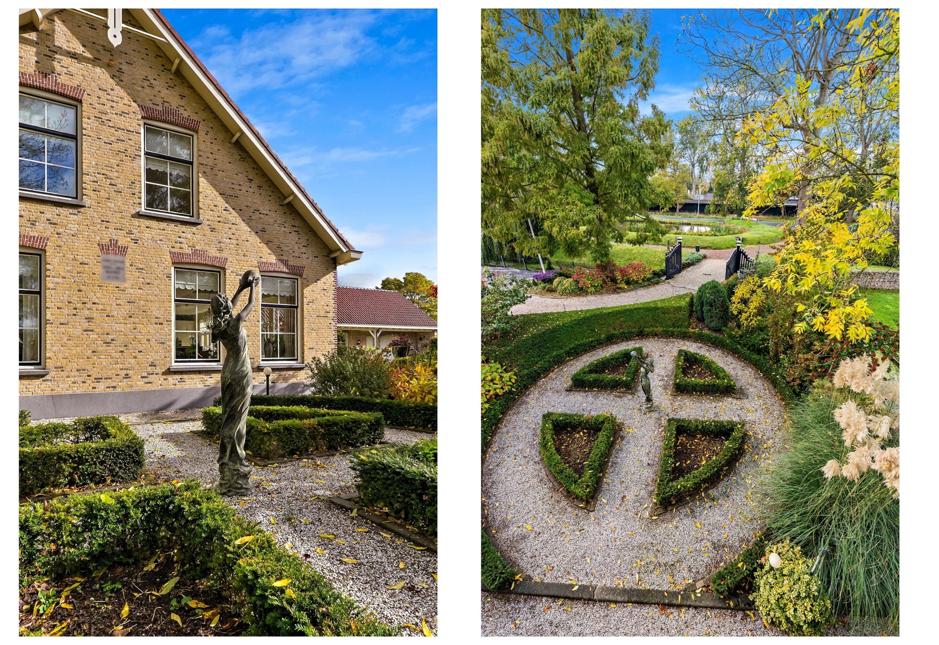 Via de eigen oprijlaan en verzorgd aangelegde tuin bereikt u de woning. Bij binnenkomst in de woning valt direct de unieke architectuur en royale opzet op. De woning is ontworpen met oog voor licht, zichtlijnen en ruimtelijkheid. Centraal in de woning bevindt zich het imposante trappenhuis, dat niet alleen functioneel is maar ook als architectonisch middelpunt fungeert en de verschillende vleugels van de woning met elkaar verbindt. Onder de trap is een inpandige vijver met Koikarpers aanwezig. Grenzend aan de hal bevindt zich de toiletruimte met wandcloset en fonteintje. Via de linkerzijde komt u in de royale woonkamer over de volledige breedte van de woning met open keuken. De in 2018 geplaatste keuken is luxe en voorzien van diverse inbouwapparatuur. Vanuit de woonkamer is de prachtige tuin met zonnig terras op het zuiden te bereiken via dubbele openslaande deuren. Met diverse grote ramen in de gevel komt er veel licht binnen. De woonkamer is voorzien van een lichte vloertegel met vloerverwarming en een gestukt plafond. In het zitgedeelte is een gasgestookte haard aanwezig met maatwerk kastenwand. Boven het eetgedeelte bevindt zich een fraaie vide, waardoor u nog meer ruimte en licht in het woongedeelte ervaart. De hoofdslaapkamer en badkamer zijn op de begane grond gelegen. De badkamer is luxe uitgevoerd en voorzien van een riante inloopdouche met sunshower en tweede toilet.. Vanuit de slaapkamer heeft u toegang tot de beschutte achtertuin. Via de hal komen we in het andere deel van de woning. Hier is de bijkeuken annex wasruimte van waar de achtertuin ook bereikbaar is. Via het achterpad is een extra berging te bereiken. De multifunctionele ruimte, welke veelal gebruikt is voor bijeenkomsten, feesten en partijen kan op diverse manieren in gebruik genomen worden. Er is zelfs een tweede badkamer met doucheruimte en toilet aanwezig. De open kap, met prachtige spantconstructie in het zicht, een open keuken en twee vides met bergruimte is voorzien van een warme plavuizen vloer met vloerverwarming. Centraal in de ruimte bevindt zich de houtkachel en via de dubbele deuren en meerdere raampartijen heeft u zicht op de sierlijke tuin. Naast de ruimte bevindt zich de inpandige, geïsoleerde garage met water en verwarming. De garage is afgesloten met een loopdeur en een elektrische overheaddeur.