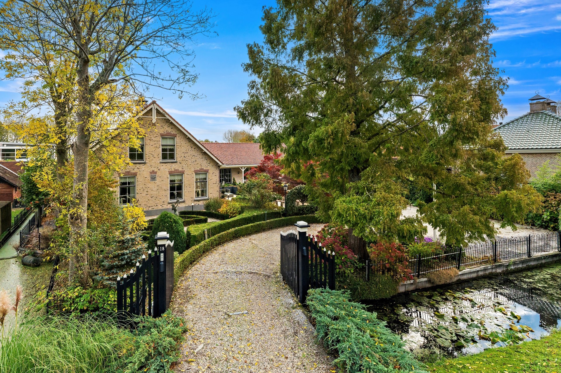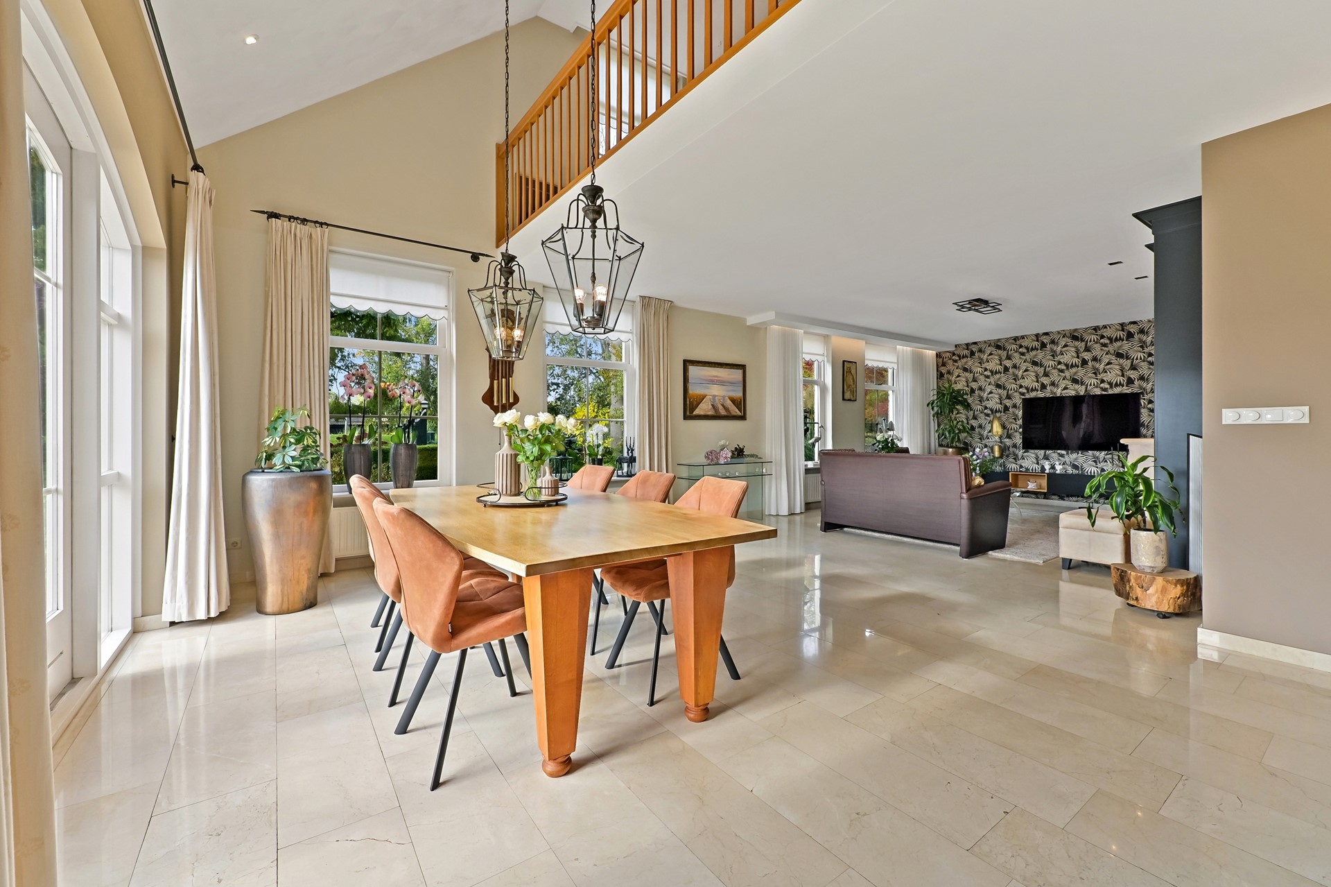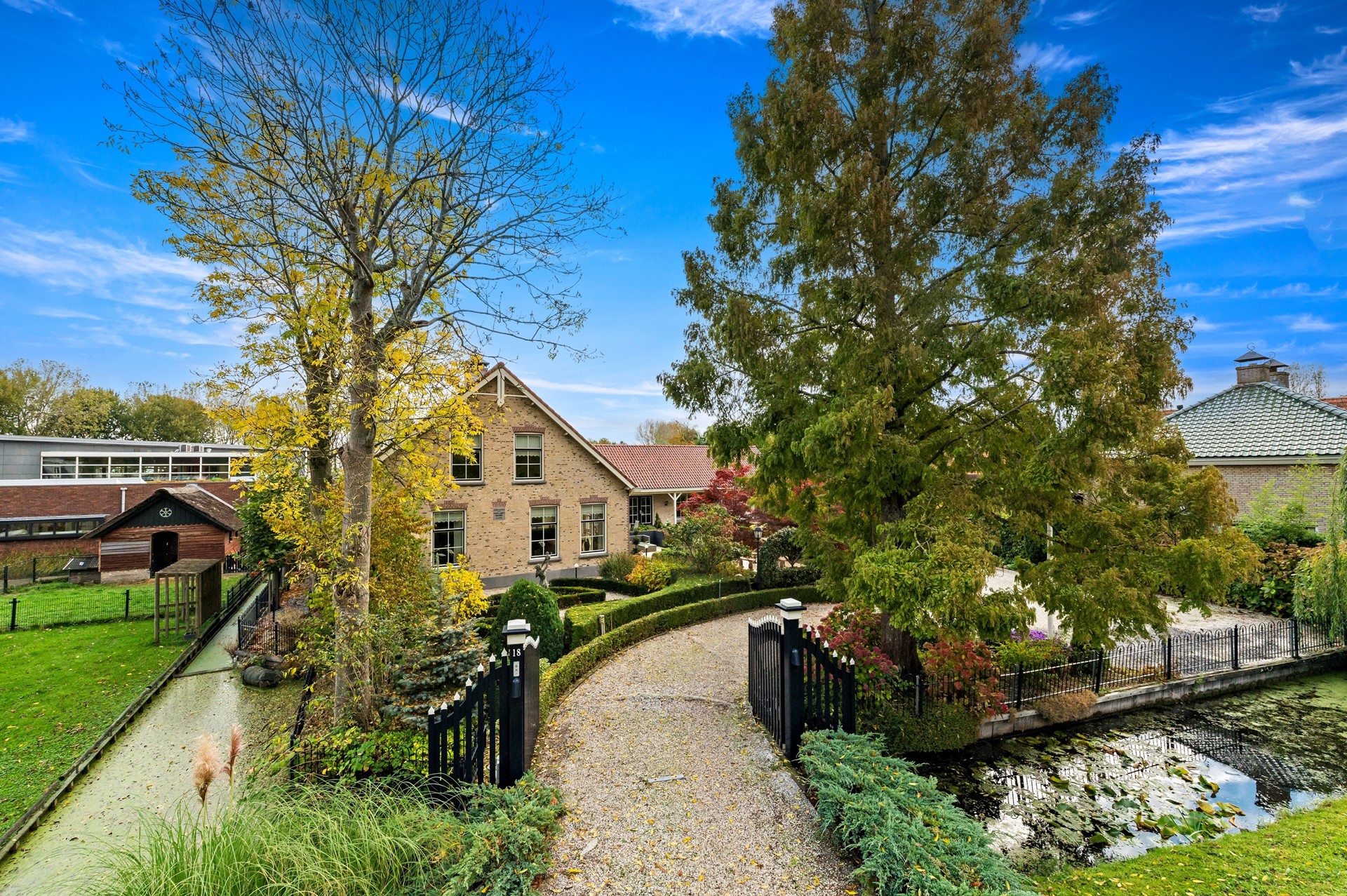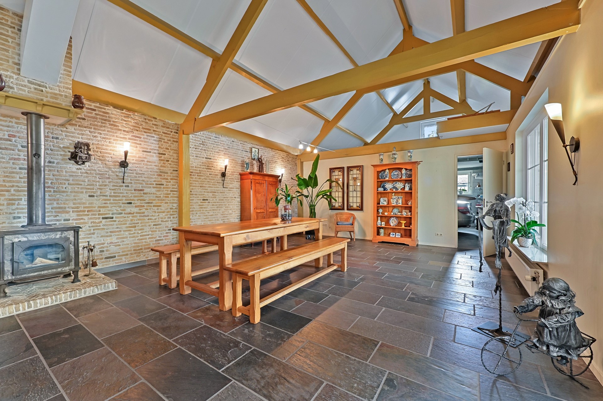 Via de eigen oprijlaan en verzorgd aangelegde tuin bereikt u de woning. Bij binnenkomst in de woning valt direct de unieke architectuur en royale opzet op. De woning is ontworpen met oog voor licht, zichtlijnen en ruimtelijkheid. Centraal in de woning bevindt zich het imposante trappenhuis, dat niet alleen functioneel is maar ook als architectonisch middelpunt fungeert en de verschillende vleugels van de woning met elkaar verbindt. Onder de trap is een inpandige vijver met Koikarpers aanwezig. Grenzend aan de hal bevindt zich de toiletruimte met wandcloset en fonteintje. Via de linkerzijde komt u in de royale woonkamer over de volledige breedte van de woning met open keuken. De in 2018 geplaatste keuken is luxe en voorzien van diverse inbouwapparatuur. Vanuit de woonkamer is de prachtige tuin met zonnig terras op het zuiden te bereiken via dubbele openslaande deuren. Met diverse grote ramen in de gevel komt er veel licht binnen. De woonkamer is voorzien van een lichte vloertegel met vloerverwarming en een gestukt plafond. In het zitgedeelte is een gasgestookte haard aanwezig met maatwerk kastenwand. Boven het eetgedeelte bevindt zich een fraaie vide, waardoor u nog meer ruimte en licht in het woongedeelte ervaart. De hoofdslaapkamer en badkamer zijn op de begane grond gelegen. De badkamer is luxe uitgevoerd en voorzien van een riante inloopdouche met sunshower en tweede toilet.. Vanuit de slaapkamer heeft u toegang tot de beschutte achtertuin. Via de hal komen we in het andere deel van de woning. Hier is de bijkeuken annex wasruimte van waar de achtertuin ook bereikbaar is. Via het achterpad is een extra berging te bereiken. De multifunctionele ruimte, welke veelal gebruikt is voor bijeenkomsten, feesten en partijen kan op diverse manieren in gebruik genomen worden. Er is zelfs een tweede badkamer met doucheruimte en toilet aanwezig. De open kap, met prachtige spantconstructie in het zicht, een open keuken en twee vides met bergruimte is voorzien van een warme plavuizen vloer met vloerverwarming. Centraal in de ruimte bevindt zich de houtkachel en via de dubbele deuren en meerdere raampartijen heeft u zicht op de sierlijke tuin. Naast de ruimte bevindt zich de inpandige, geïsoleerde garage met water en verwarming. De garage is afgesloten met een loopdeur en een elektrische overheaddeur.