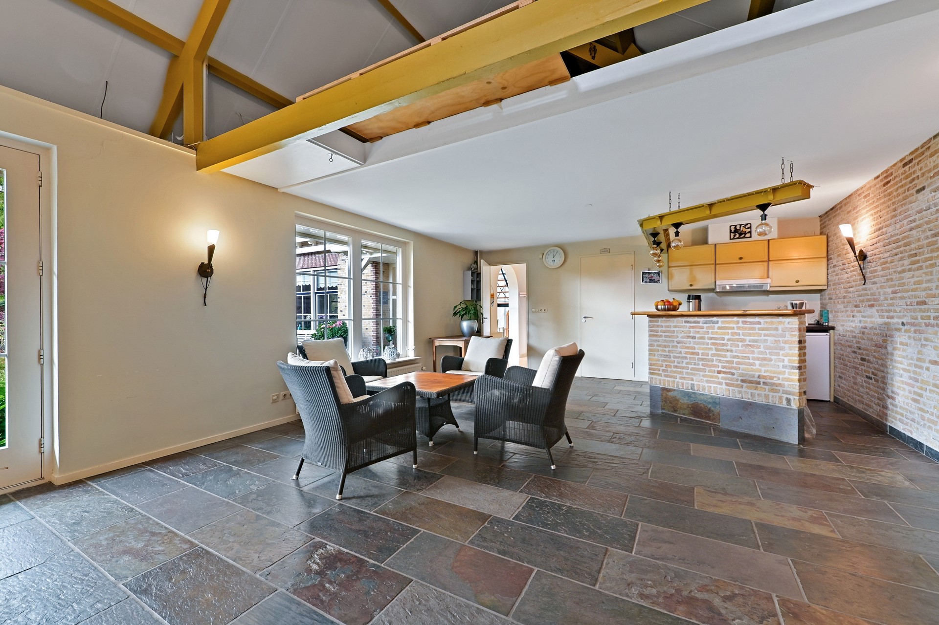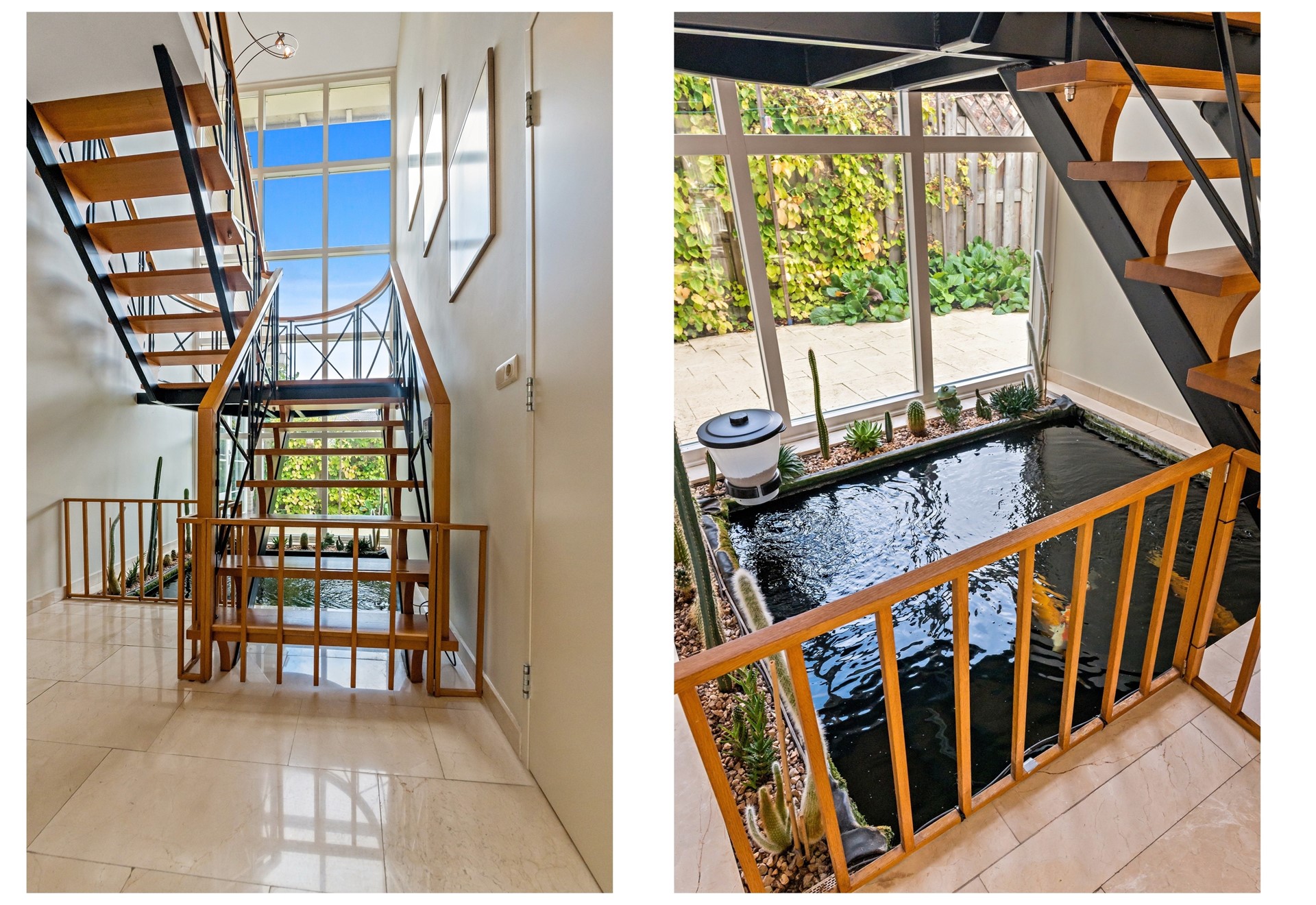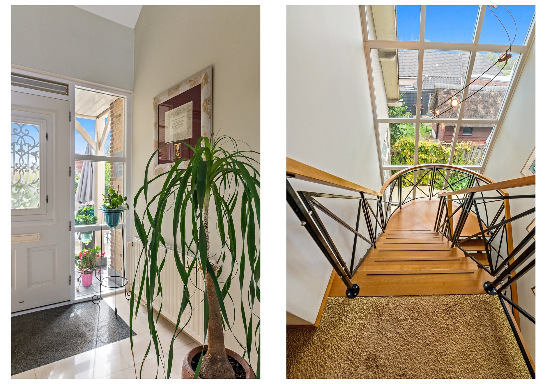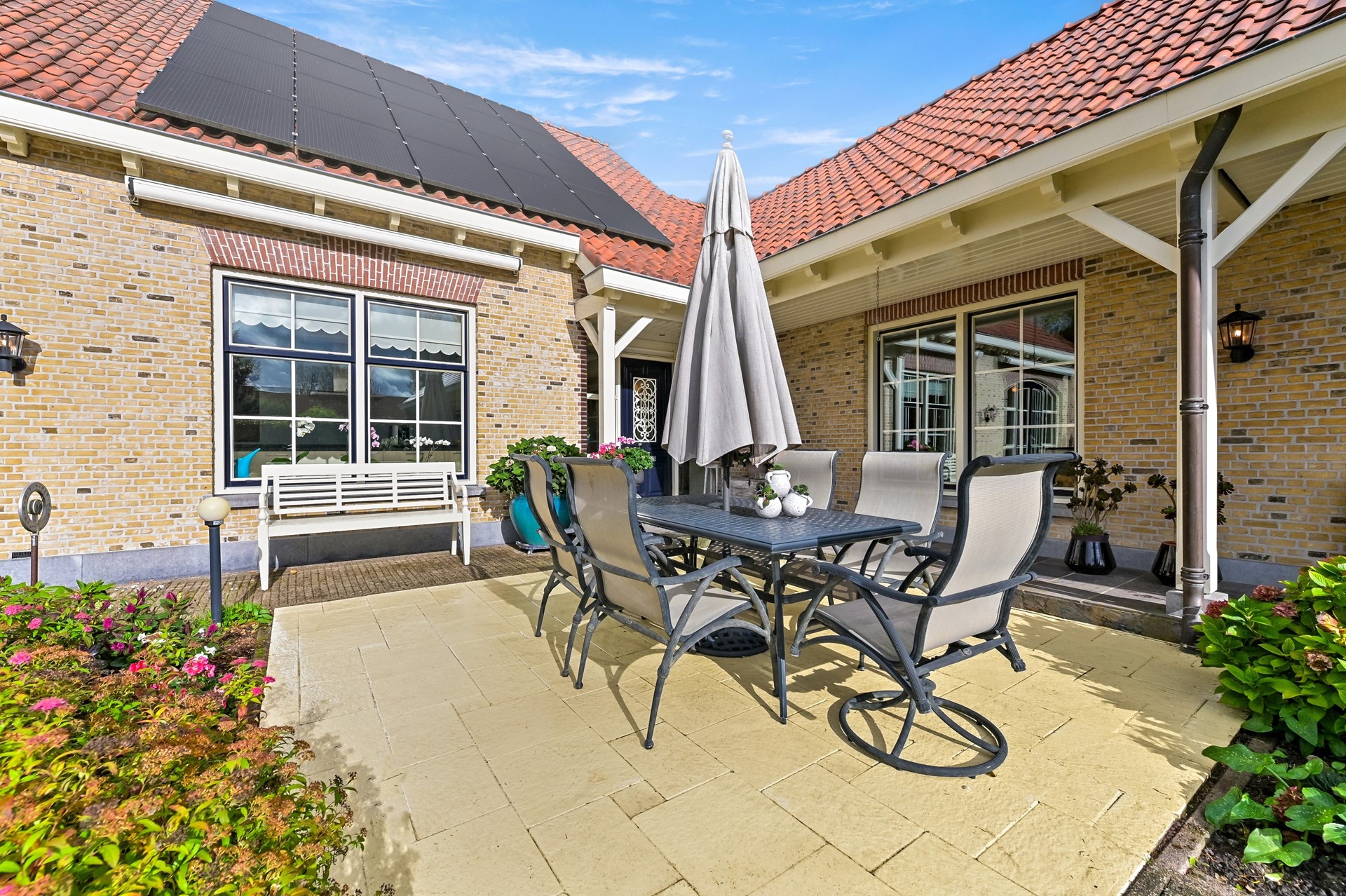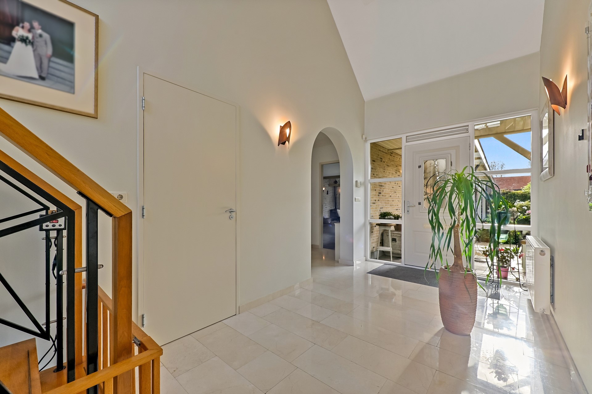 Via de eigen oprijlaan en verzorgd aangelegde tuin bereikt u de woning. Bij binnenkomst in de woning valt direct de unieke architectuur en royale opzet op. De woning is ontworpen met oog voor licht, zichtlijnen en ruimtelijkheid. Centraal in de woning bevindt zich het imposante trappenhuis, dat niet alleen functioneel is maar ook als architectonisch middelpunt fungeert en de verschillende vleugels van de woning met elkaar verbindt. Onder de trap is een inpandige vijver met Koikarpers aanwezig. Grenzend aan de hal bevindt zich de toiletruimte met wandcloset en fonteintje. Via de linkerzijde komt u in de royale woonkamer over de volledige breedte van de woning met open keuken. De in 2018 geplaatste keuken is luxe en voorzien van diverse inbouwapparatuur. Vanuit de woonkamer is de prachtige tuin met zonnig terras op het zuiden te bereiken via dubbele openslaande deuren. Met diverse grote ramen in de gevel komt er veel licht binnen. De woonkamer is voorzien van een lichte vloertegel met vloerverwarming en een gestukt plafond. In het zitgedeelte is een gasgestookte haard aanwezig met maatwerk kastenwand. Boven het eetgedeelte bevindt zich een fraaie vide, waardoor u nog meer ruimte en licht in het woongedeelte ervaart. De hoofdslaapkamer en badkamer zijn op de begane grond gelegen. De badkamer is luxe uitgevoerd en voorzien van een riante inloopdouche met sunshower en tweede toilet.. Vanuit de slaapkamer heeft u toegang tot de beschutte achtertuin. Via de hal komen we in het andere deel van de woning. Hier is de bijkeuken annex wasruimte van waar de achtertuin ook bereikbaar is. Via het achterpad is een extra berging te bereiken. De multifunctionele ruimte, welke veelal gebruikt is voor bijeenkomsten, feesten en partijen kan op diverse manieren in gebruik genomen worden. Er is zelfs een tweede badkamer met doucheruimte en toilet aanwezig. De open kap, met prachtige spantconstructie in het zicht, een open keuken en twee vides met bergruimte is voorzien van een warme plavuizen vloer met vloerverwarming. Centraal in de ruimte bevindt zich de houtkachel en via de dubbele deuren en meerdere raampartijen heeft u zicht op de sierlijke tuin. Naast de ruimte bevindt zich de inpandige, geïsoleerde garage met water en verwarming. De garage is afgesloten met een loopdeur en een elektrische overheaddeur.