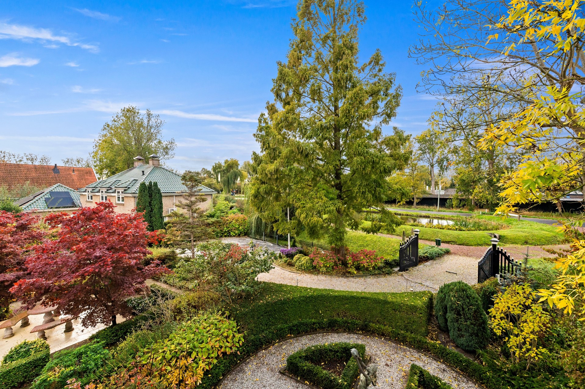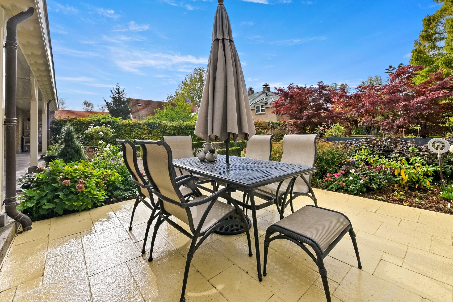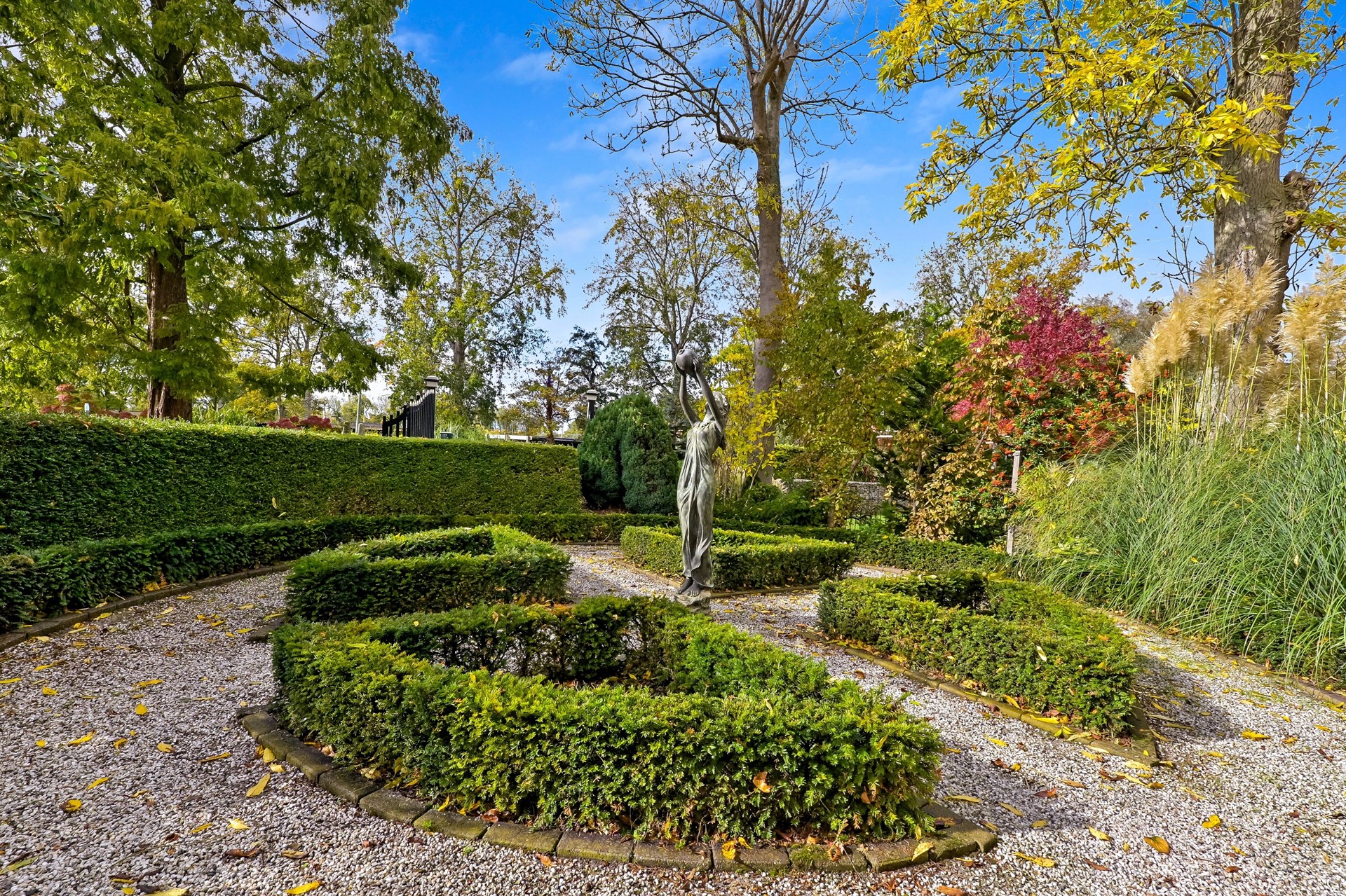 De fraai aangelegde tuin grenzend aan de woning is een lust voor het oog. Aan de voorzijde een klassieke tuinopzet met geometrische vormen, aan de achterzijde volop privacy in de beschut gelegen achtertuin. De lange oprit biedt bovendien ruimte voor meerdere auto’s op eigen terrein.